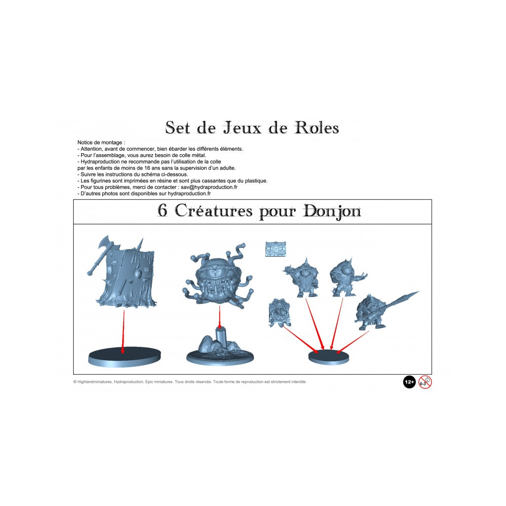 Dans cette boîte, vous trouverez de quoi assembler 6 créatures pour Donjon. Ces figurines sont compatibles avec tous systèmes de jeu utilisant des figurines 28-32 mm comme par exemple Dungeons & Dragons.