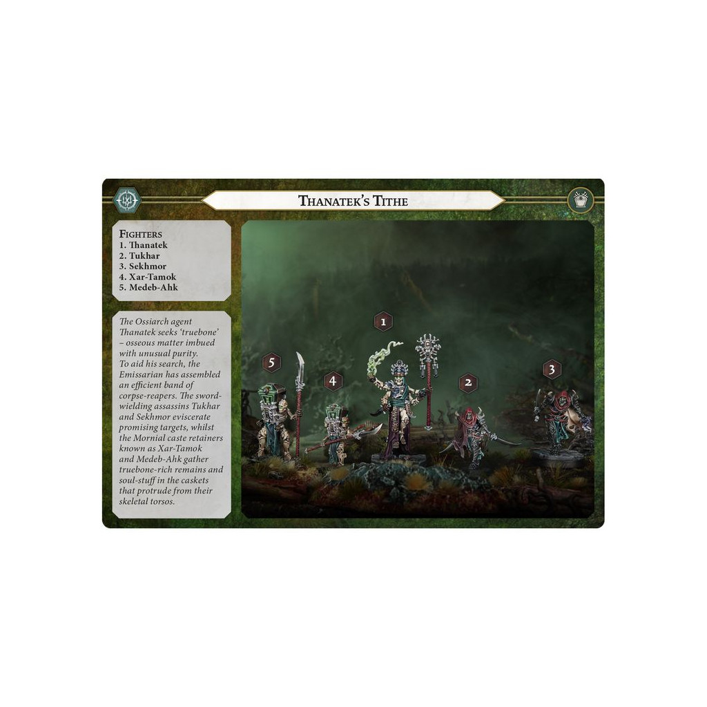 L'agent ossiarque Thanatek cherche de "l'os véritable", de la matière osseuse caractérisée par une pureté inhabituelle. Pour l'aider dans ses recherches, l'Émissaire a rassemblé une bande efficace de récolteurs de cadavres. Les assassins armés d'épées Tukhar et Sekhmor éviscèrent les proies prometteuses, tandis que les serviteurs de la caste Mornial appelés Xar-Tamok et Medeb-Ahk collectent les restes riches en os véritable et la matière spirituelle dans les coffrets qui saillent de leurs torses squelettiques.