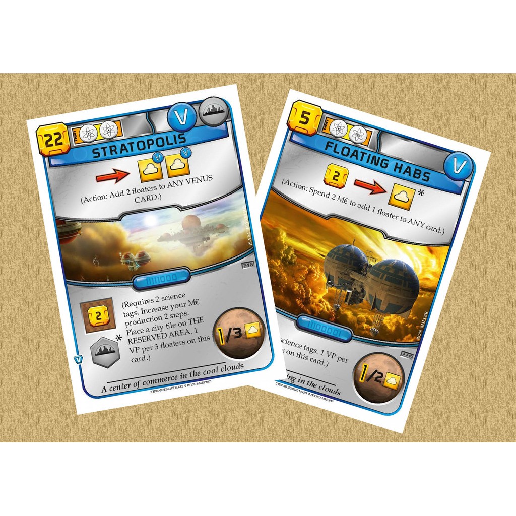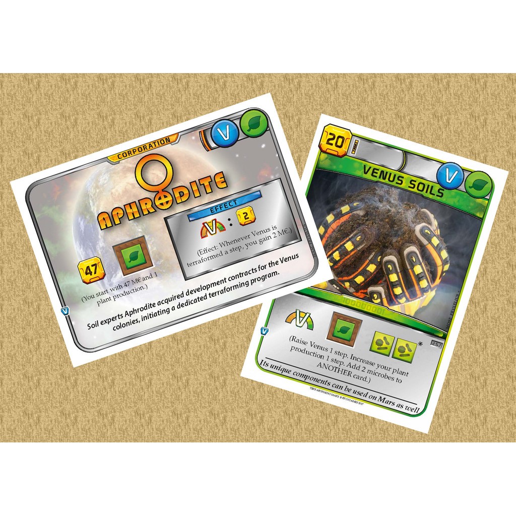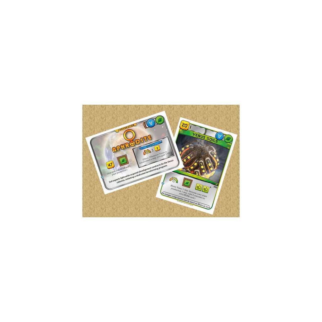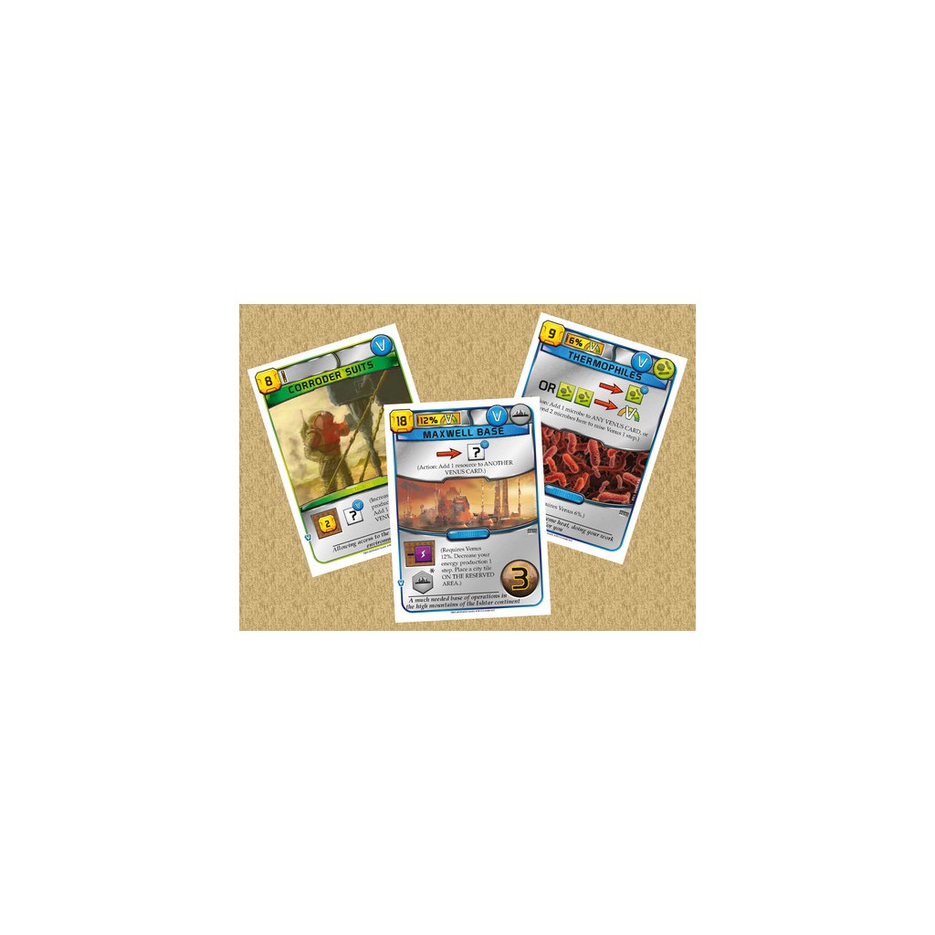 Perchés dans les nuages corrosifs, loin de la surface brûlante, les humains ont commencé à coloniser et à terraformer la planète. Voici une excellente occasion pour votre corporation de se faire un nom, de bâtir des villes volantes, de masquer le soleil afin d’atténuer l’effet de serre et d’introduire la vie sur ce nouveau monde ! Et puis, Vénus devrait pouvoir vous aider à terraformer Mars !