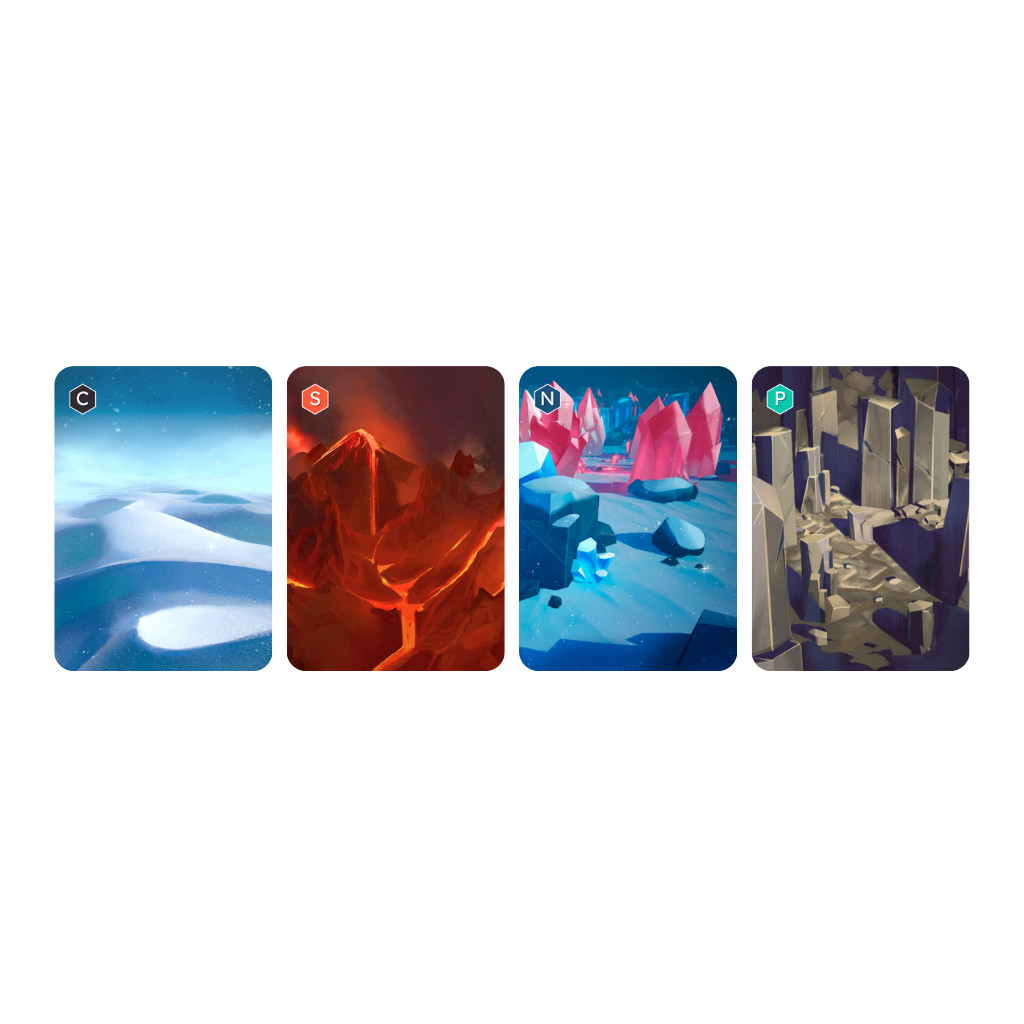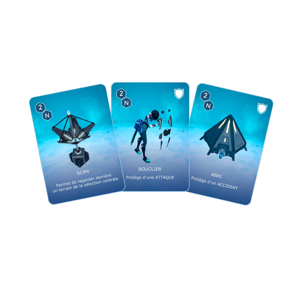 Au centre de la table, des terrains sont disposés pour être explorés. Au cours de chaque tour des actions sont lancées pour collecter un maximum d’éléments. Les éléments permettent de constituer des combinaisons (H2O, CO2, etc.).