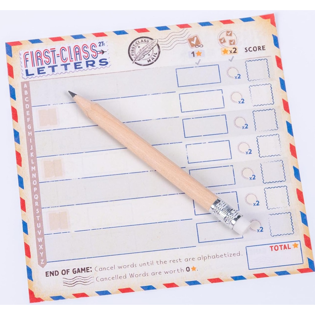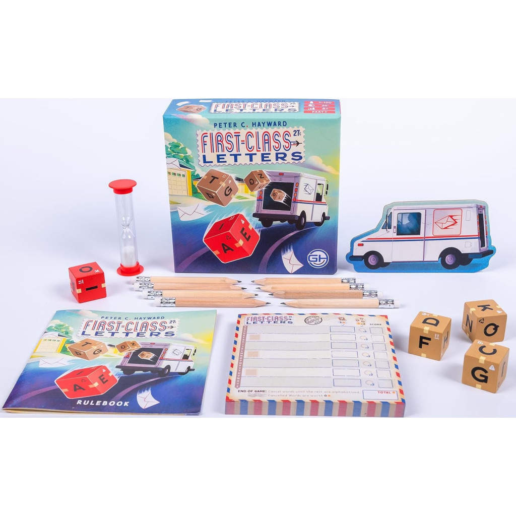First Class Letters est un jeu de lettres à jouer en 7 manches. À chaque manche, les joueurs écrivent un mot sur leur feuille en utilisant les lettres obtenues en lançant les dés, autant qu'ils le peuvent. Les mots sur leur feuille doivent être classés par ordre alphabétique, sinon ils sont annulés !