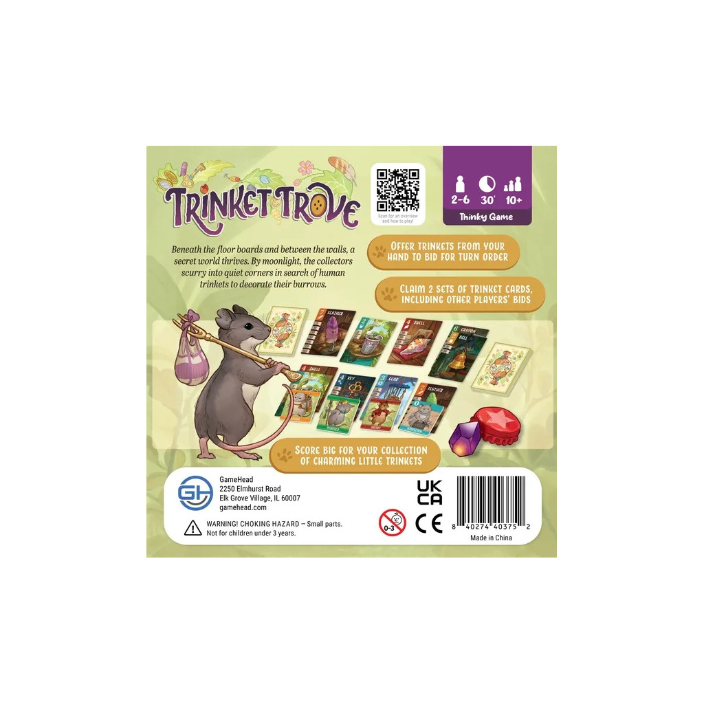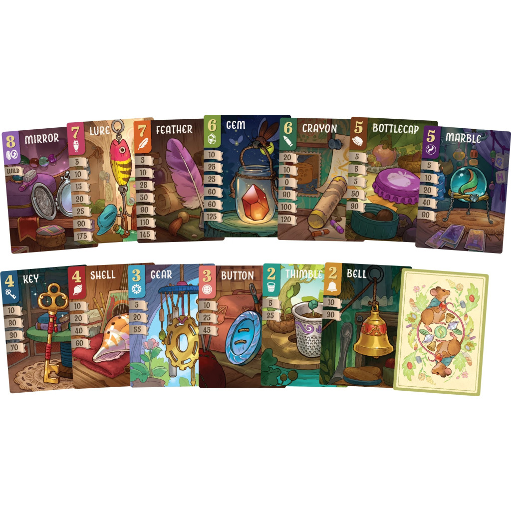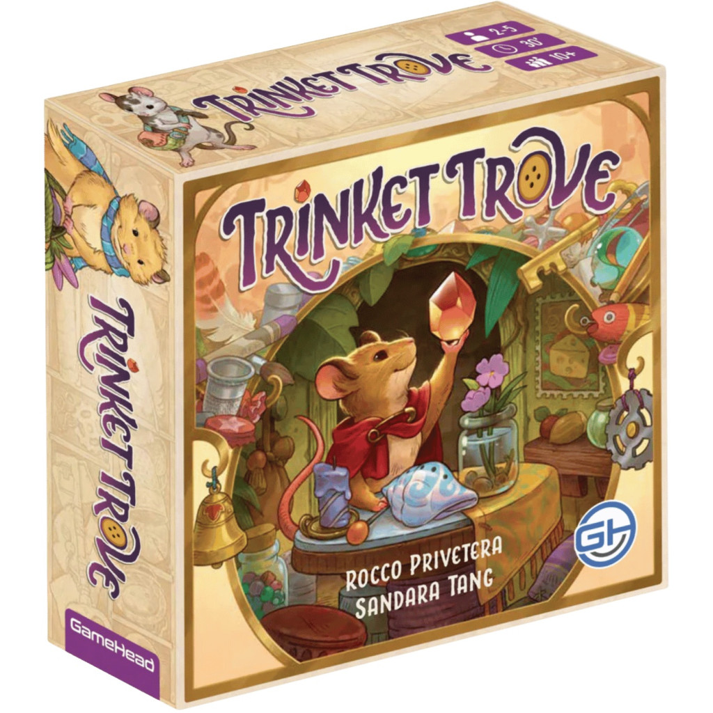 Dans le jeu Trinket Trove, vous incarnez un collectionneur, une adorable petite créature vivant en marge du monde humain. Vous échangez et collectionnez des séries de bibelots pour décorer votre terrier. Vous commencez avec 4 cartes bibelots en main, et à chaque tour, de nouvelles cartes bibelots sont tirées face visible au centre de la table.