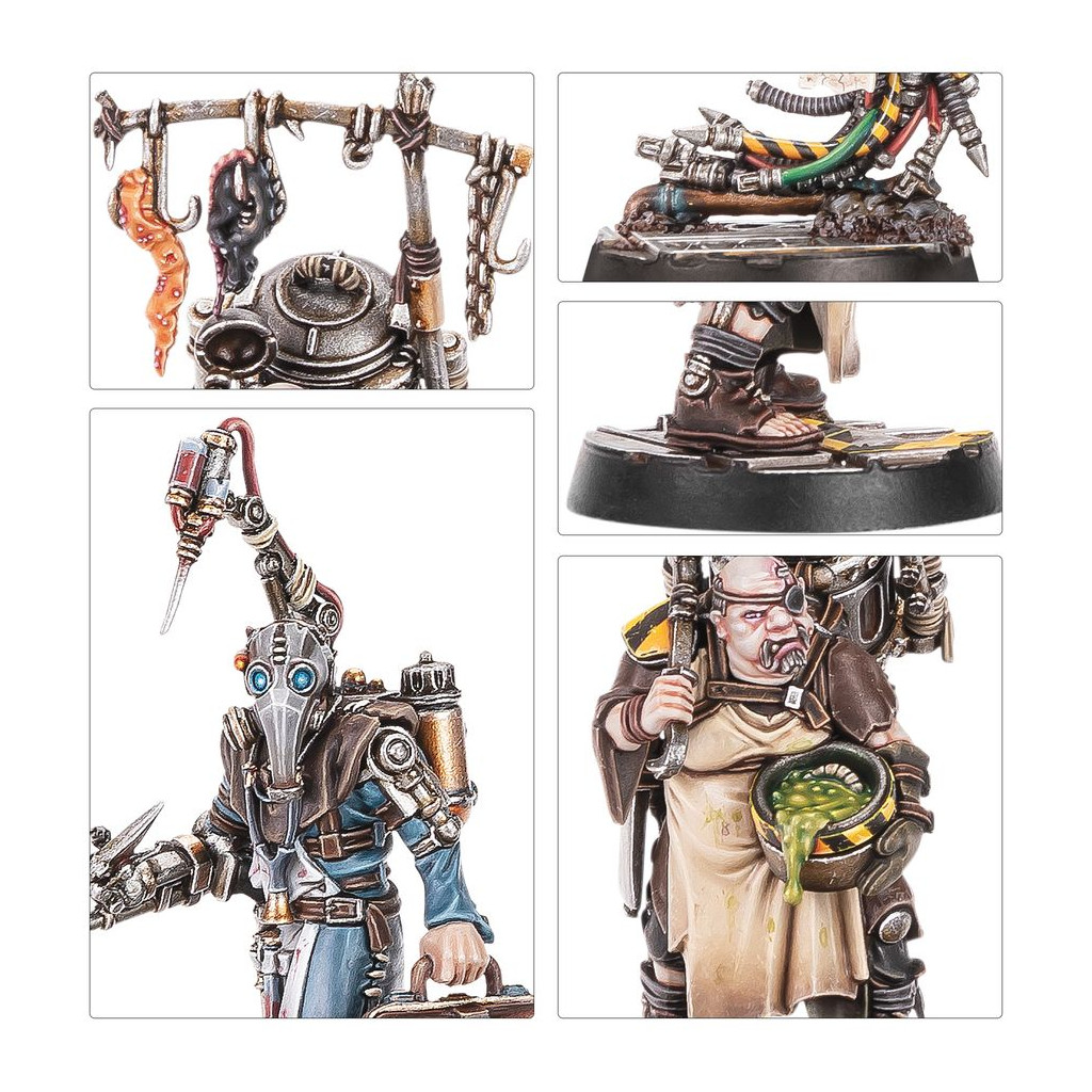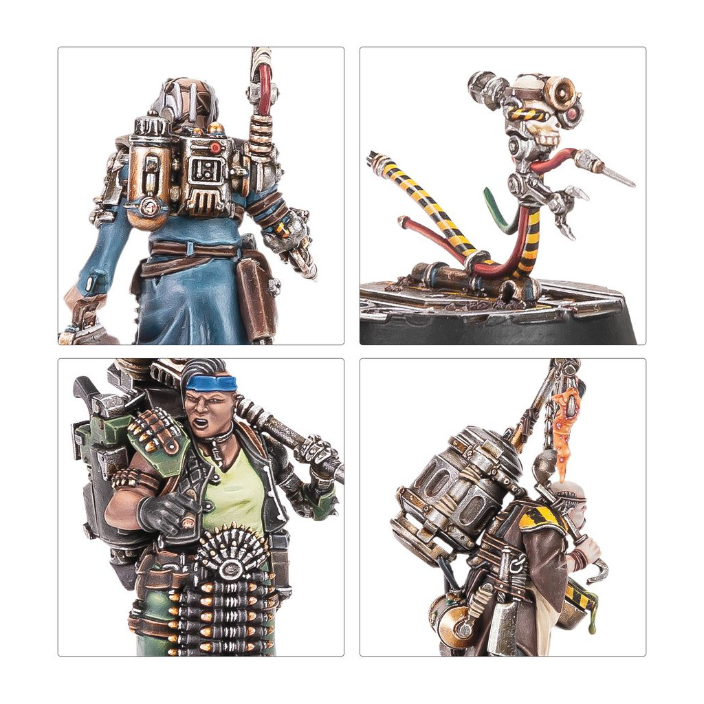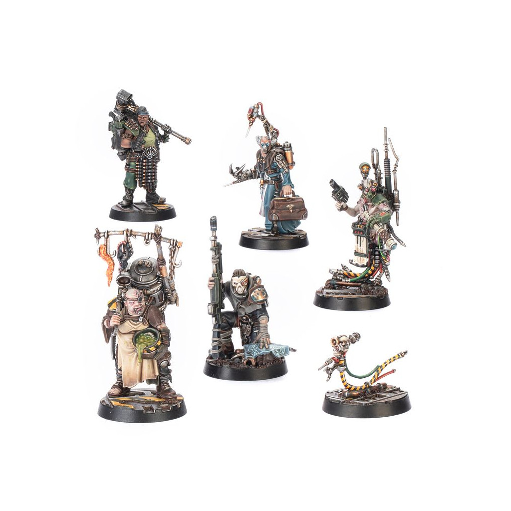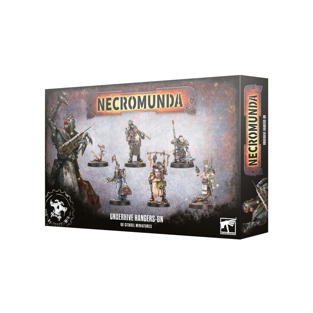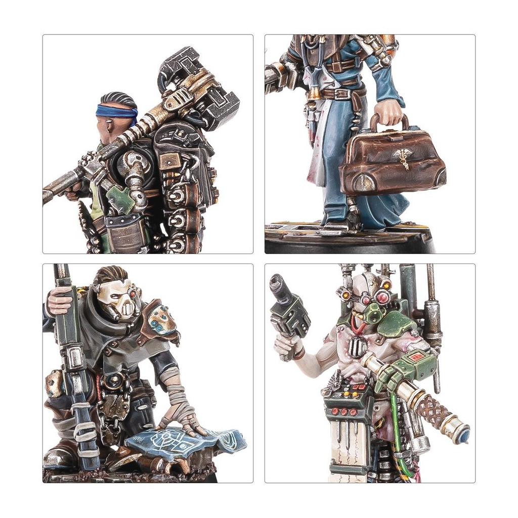 Ce kit en plastique permet d'assembler un ensemble de Hangers-on accompagnés d'un medi skull, des renforts utiles pour vos gangs lors des parties de Necromunda. Cette équipe disparate offrira un bonus à vos combattants, que ce soit avant, pendant ou après les combats.