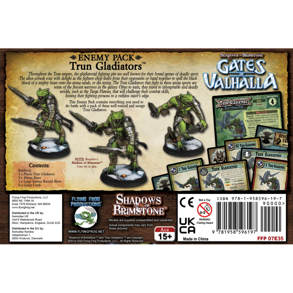 Cette boite contient 3 grandes figurines de Gladiateurs Trun, ainsi que la grande fiche d’ennemi et toutes les cartes de menace nécessaires pour les intégrer à vos parties.