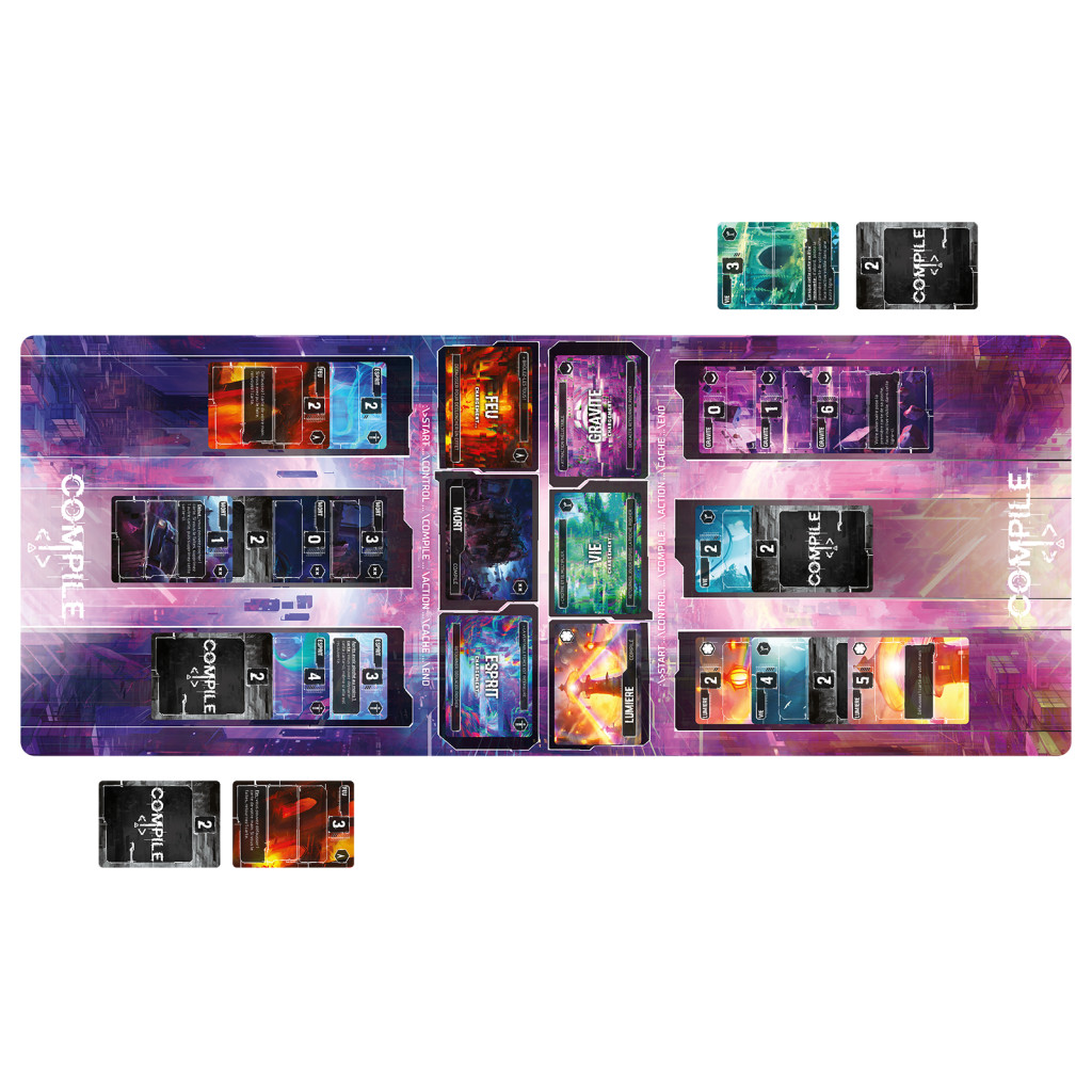 Deux joueurs sélectionnent chacun trois protocoles à tester. Des concepts allant de l'obscurité à l'eau s'affrontent pour atteindre la compréhension ultime. Jouez des cartes dans les lignes de commande de vos protocoles pour franchir le seuil et vaincre votre adversaire afin de compiler.