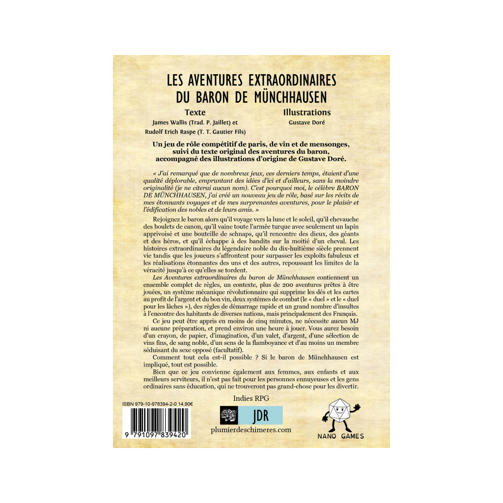 « J’ai remarqué que de nombreux jeux, ces derniers temps, étaient d’une qualité déplorable, empruntant des idées d’ici et d’ailleurs, sans la moindre originalité (je ne citerai aucun nom). C’est pourquoi moi, le célèbre BARON DE MUNCHAUSEN, j’ai créé un nouveau jeu de rôle, basé sur les récits de mes étonnants voyages et de mes surprenantes aventures, pour le plaisir et l’édification des nobles et de leurs amis. »