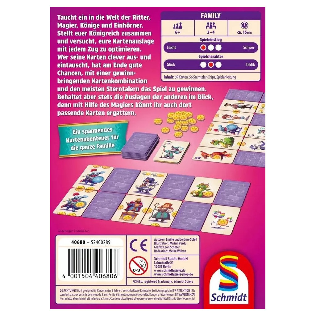 Au début de la partie, chaque joueur dispose de douze cartes posées devant lui en deux rangées. À la fin, chacun aura construit son propre royaume, peuplé de chevaliers et de rois, de créatures magiques et de leurs gardiennes. Celui qui réussit la meilleure combinaison récolte le plus d’étoiles d’argent. Il faut pour cela optimiser son jeu tour après tour et échanger des cartes. A vous de choisir de prendre des risques ou de jouer la sécurité.