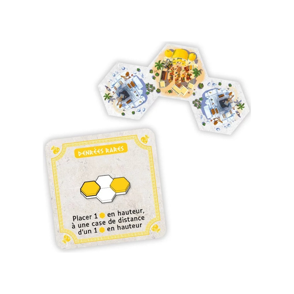 Les joueurs choisissent ensemble un scénario parmi Corinthe, Sparte ou Athènes, chacun proposant une difficulté différente. Chaque joueur reçoit une tuile de départ, tandis que les tuiles restantes forment le cœur de la Capitale. Trois tuiles Défi Architectural sont révélées, accompagnées de leurs Autels Divins correspondants. Les joueurs reçoivent également des cubes Pierre et des tuiles Cité, à garder en main comme des cartes. Contrairement au jeu de base, il n’y a pas de rivière.