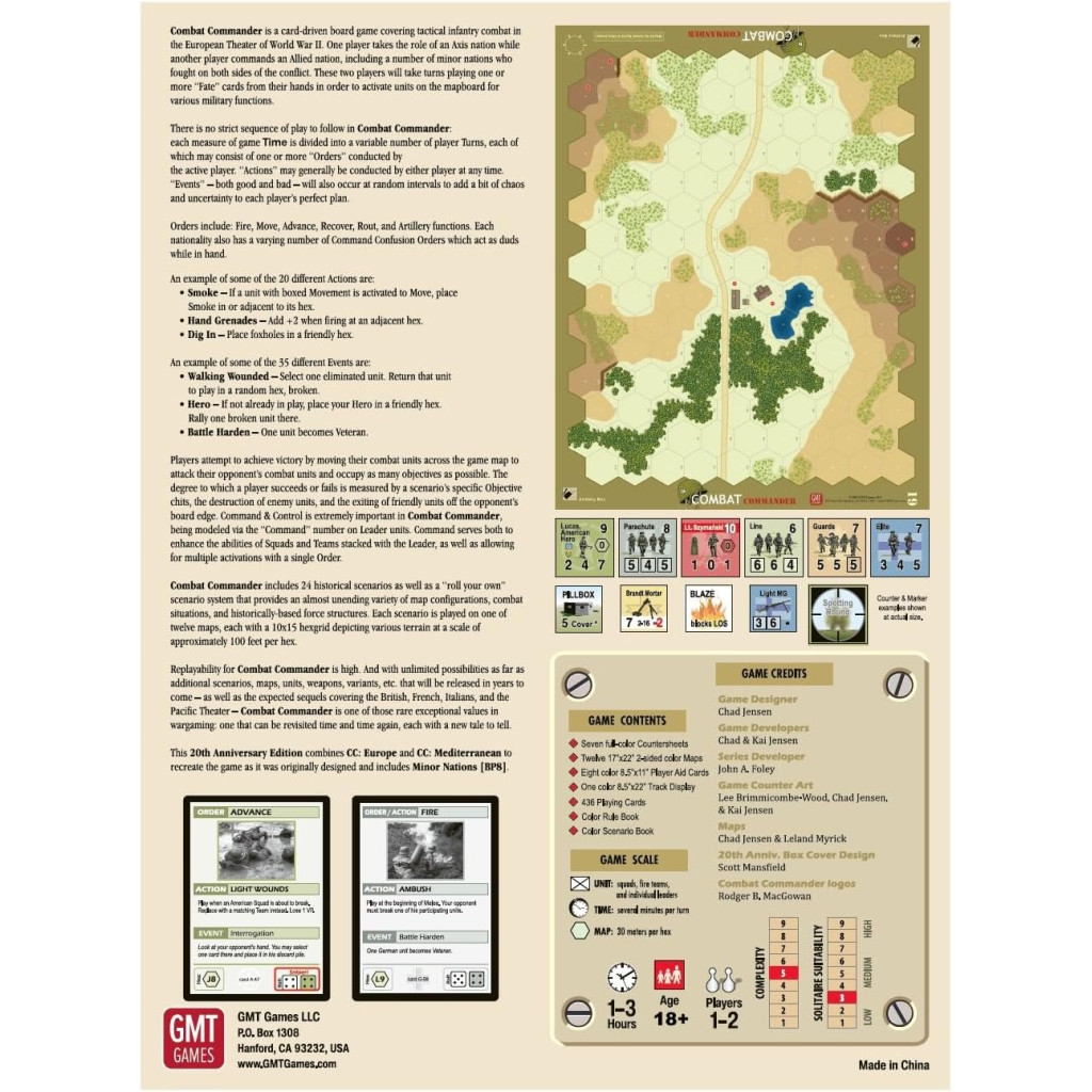 Combat Commander: Europe est le jeu de plateau primé à cartes dirigé de Chad Jensen, qui plonge les joueurs dans des combats d'infanterie tactiques pendant le théâtre européen de la Seconde Guerre mondiale. Un joueur incarne l'Allemagne, tandis qu'un autre joueur commande soit les États-Unis, soit la Russie. Ces deux joueurs joueront à tour de rôle une ou plusieurs cartes de "Destin" de leur main afin d'activer des unités sur la carte pour diverses fonctions militaires.