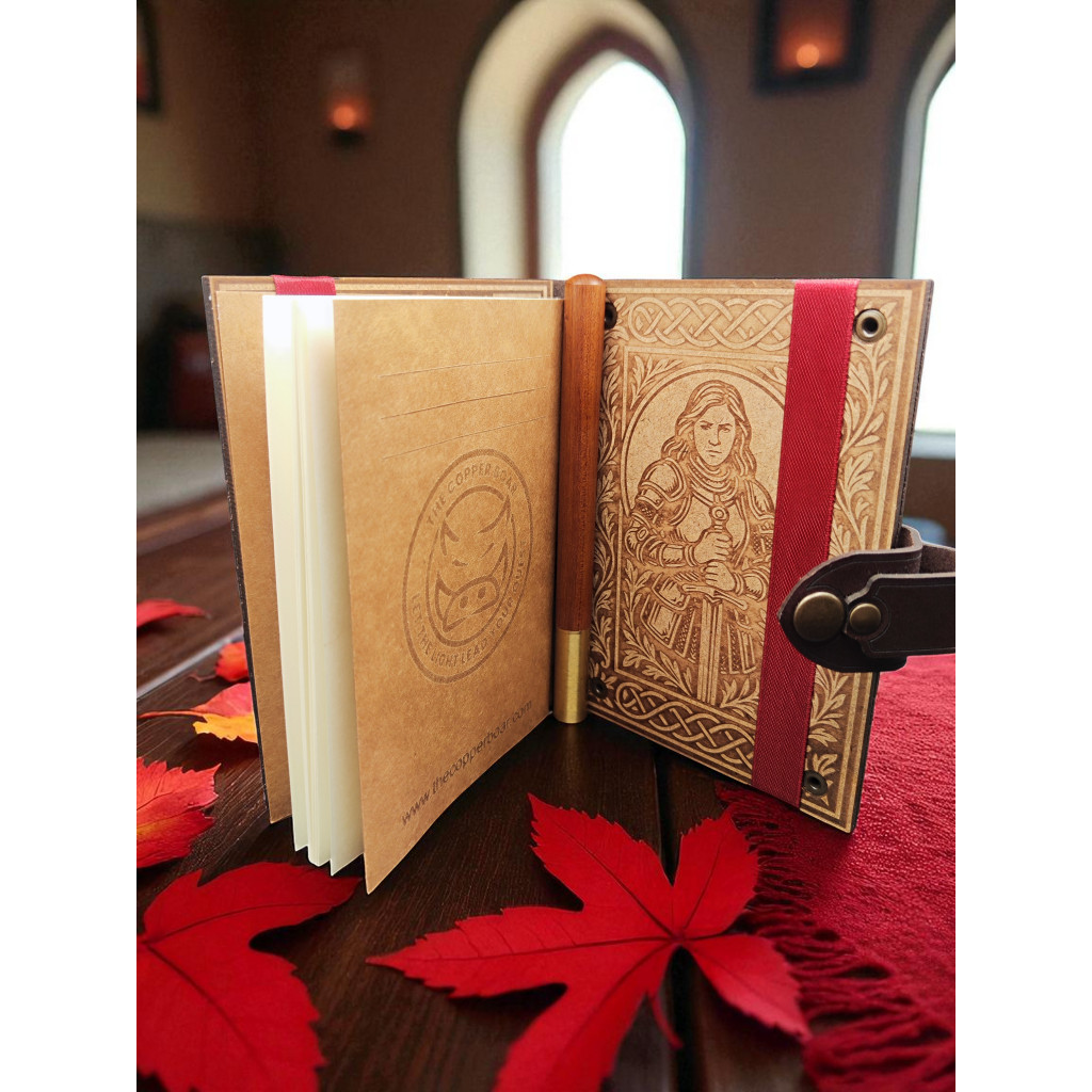 Ce carnet d’aventurier est pensé pour ceux qui veulent un objet qui accompagne réellement la partie. Le cuir épais donne une sensation de robustesse dès la première prise en main, tandis que les couvertures en bois gravé apportent un style immédiatement reconnaissable. Huit rivets en laiton maintiennent l’ensemble, offrant un carnet prêt à encaisser des heures de jeu, des manipulations répétées et les conditions d’un GN.
