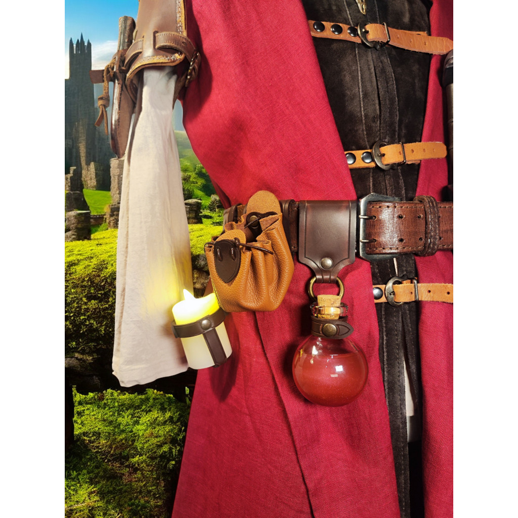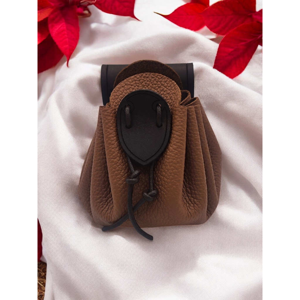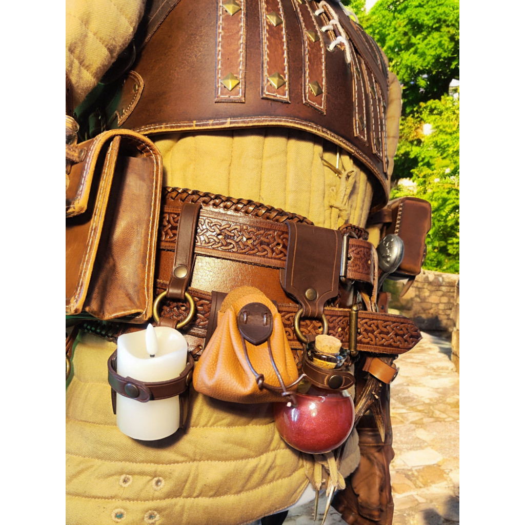 Cette bourse de ceinture en cuir grainé apporte une présence visuelle immédiate et une réelle fonctionnalité sur le terrain. Le cuir souple, au grain marqué, offre une belle texture et un tombé naturel, tandis que le contraste entre le marron clair du sac et le marron foncé de l’attache donne un rendu élégant et crédible dans un univers médiéval.
