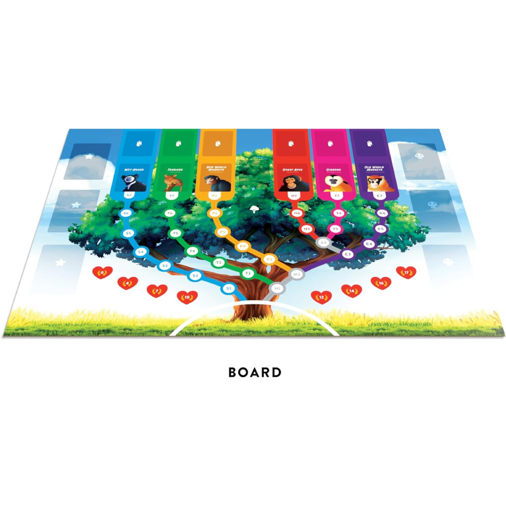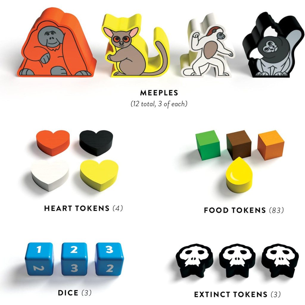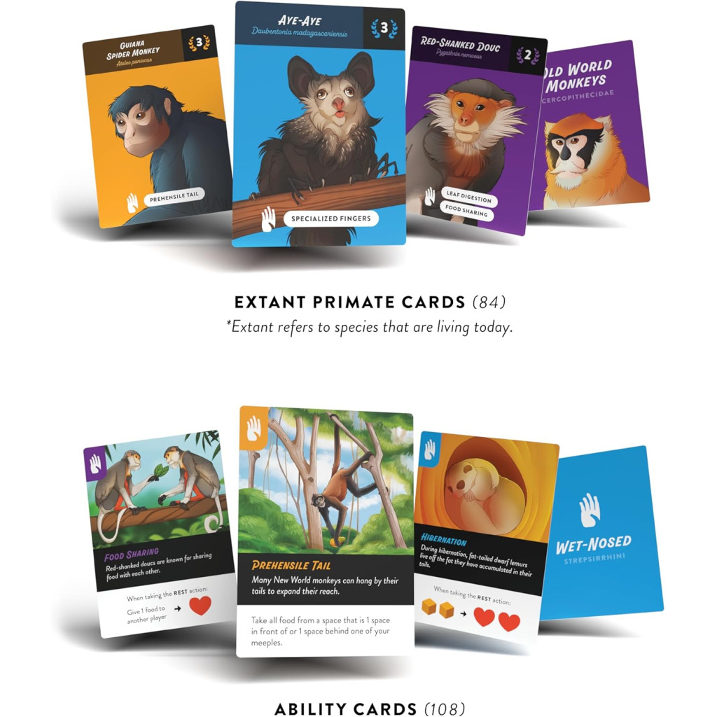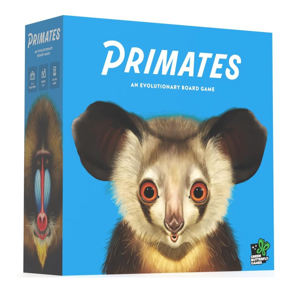Primates est un jeu de société évolutif qui vous permet d’explorer l’évolution de plus de 100 espèces de primates différentes. Faites évoluer vos primates et tentez de devancer vos adversaires en recherchant de la nourriture et en développant des liens sociaux. Au fur et à mesure de leur évolution, vos primates acquièrent des capacités spéciales. Que vous préfériez l’agilité des gibbons ou la mémoire exceptionnelle des chimpanzés, le choix vous appartient. Vous déterminez la voie évolutive à suivre.
