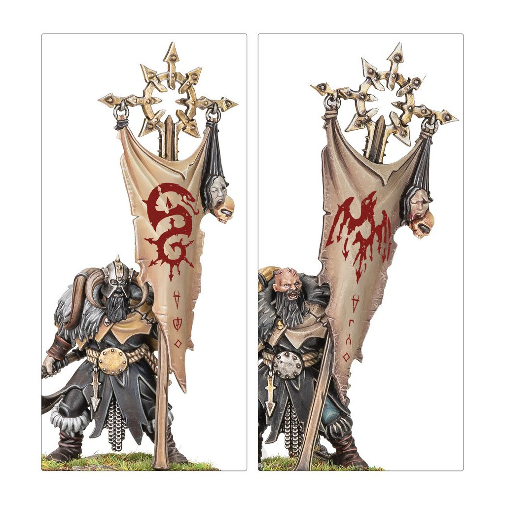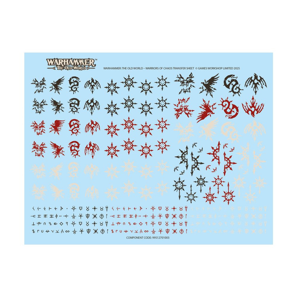 Ce kit est fourni avec 2x Planches de Décalcos des Guerriers du Chaos, proposant chacune 246x décalcos de grande qualité. Elles incluent des marquages pour le Culte du Chien Sanglant, le Culte du Serpent Sinueux, le Culte de la Corneille Noire et le Culte du Rapace Néfaste, ainsi que d'autres symboles et runes maudites du Chaos.