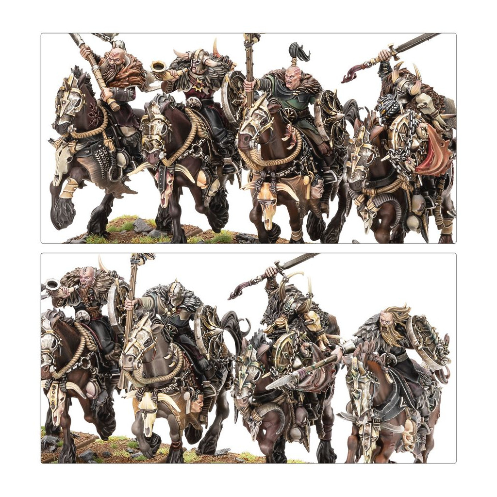 Les Cavaliers Maraudeurs peuvent être assemblés en une seule grande unité de 10, ou deux unités de 5, chacune avec ses propres champions, porte-étendards et musiciens optionnels. Chaque Maraudeur peut être équipé soit d'une lance et d'un bouclier, soit d'un fléau, et chacun d'eux dispose d'un choix de deux têtes, casquée ou nue.