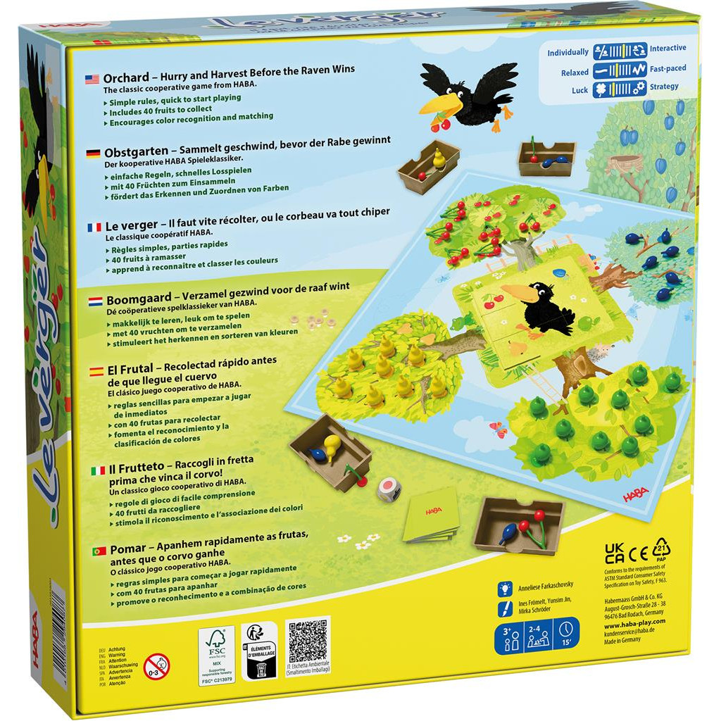 Le verger est un jeu de dés et de coopération pour les jeunes enfants, qui doivent unir leurs forces pour récupérer les fruits avant le volatile. À chaque tour, lancez le dé pour essayer de cueillir les fruits avant de les déposer dans vos paniers. La partie est gagnée si les enfants récupèrent tous les fruits avant que le puzzle du corbeau ne soit entièrement constitué.