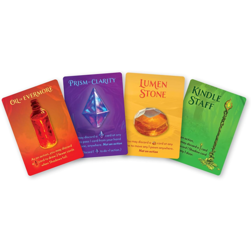 Chaque fois que les joueurs doivent remélanger la pioche, le niveau d’ombre augmente — et il grimpera de plus en plus vite à mesure que la partie avance, car certaines cartes (comme les sorts à effet unique) sont retirées du jeu au lieu d’être défaussées. Si vous ne pouvez plus remélanger de cartes ou si le niveau d’ombre atteint son maximum, la partie est perdue.