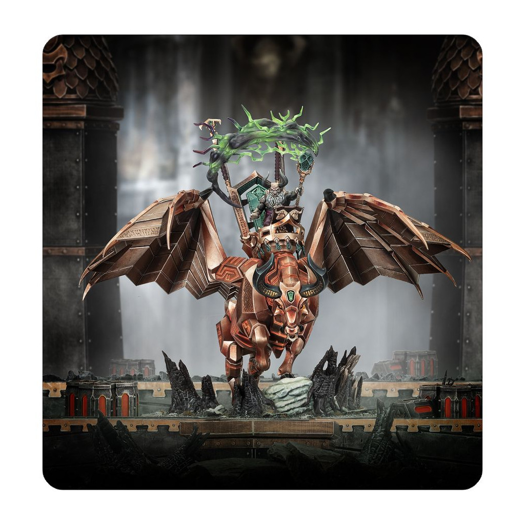 Ce kit en plastique permet d'assembler Urak Taar, monté sur son Taurus Infernal, Ghorrakos. En tant que premier et plus grand des Forgedémons, il constitue le meneur ultime pour vos armées de Forgeruines de Hashut dans les parties de Warhammer Age of Sigmar. Urak Taar sème une terreur absolue sur le champ de bataille, en frappant avec ses sorts tandis même que sa monture encorne ses ennemis et les écrase au sol sous ses sabots de métal. D'une hauteur de 144mm, avec des ailes d'une envergure de 193mm, cette figurine imprégnée d'une sombre majesté dominera toute votre armée par sa taille, ainsi que le champ de bataille. Ses détails saisissants, incluant de la chair frappée par la sarcolithe, des runes et des gemmes, mettront au défi vos talents de peintre. Taar peut être assemblé avec ou sans torrents de ruine autour de son bâton.