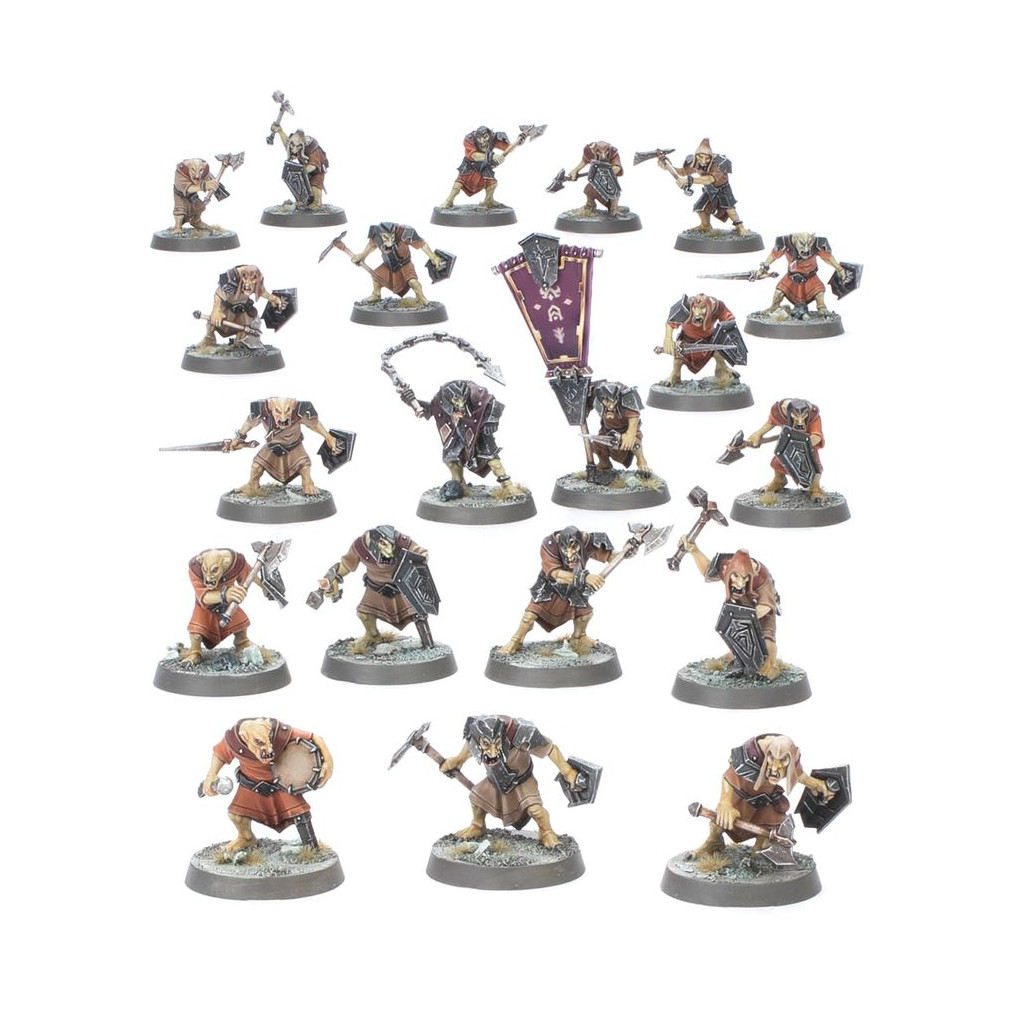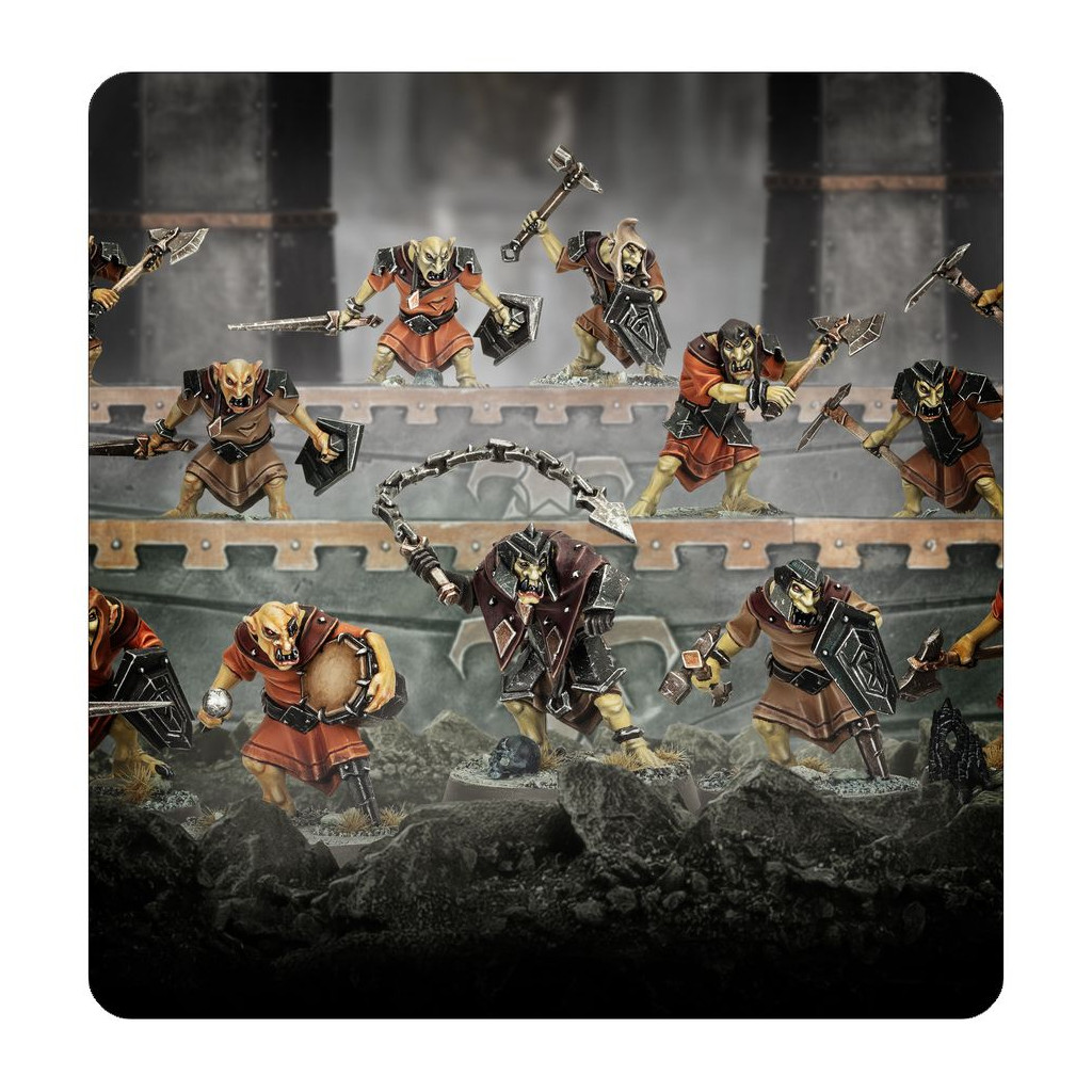 Ce kit en plastique permet d'assembler 20 Vandales Hobgrots, de l'infanterie légère pour vos armées de Forgeruines de Hashut dans les parties de Warhammer Age of Sigmar. Ils sont idéaux pour submerger l'adversaire, protéger des unités vitales et aller prendre des objectifs exposés. Équipés de boucliers et d'armes de récupération, incluant un mélange de marteaux, de lames et de piolets, ils sont prêts à se jeter au combat. Le kit inclut aussi les éléments pour assembler deux porte-étendard, musiciens et champions optionnels, armés au choix d'une dague ou d'une arme à chaîne.