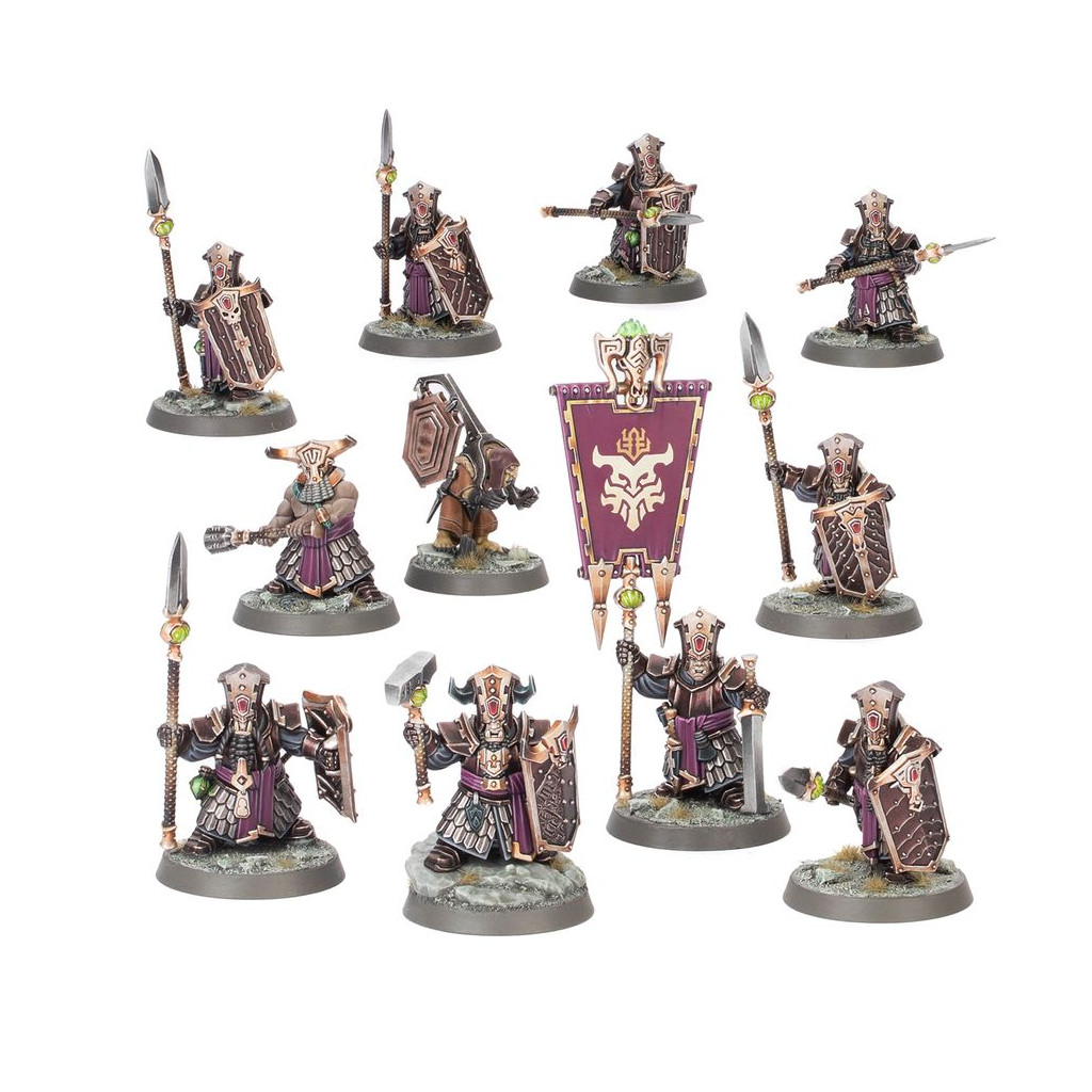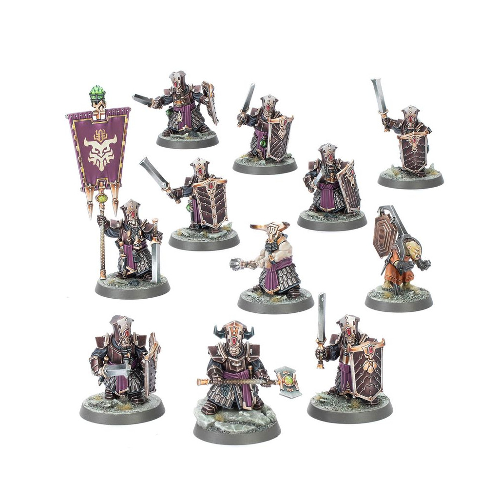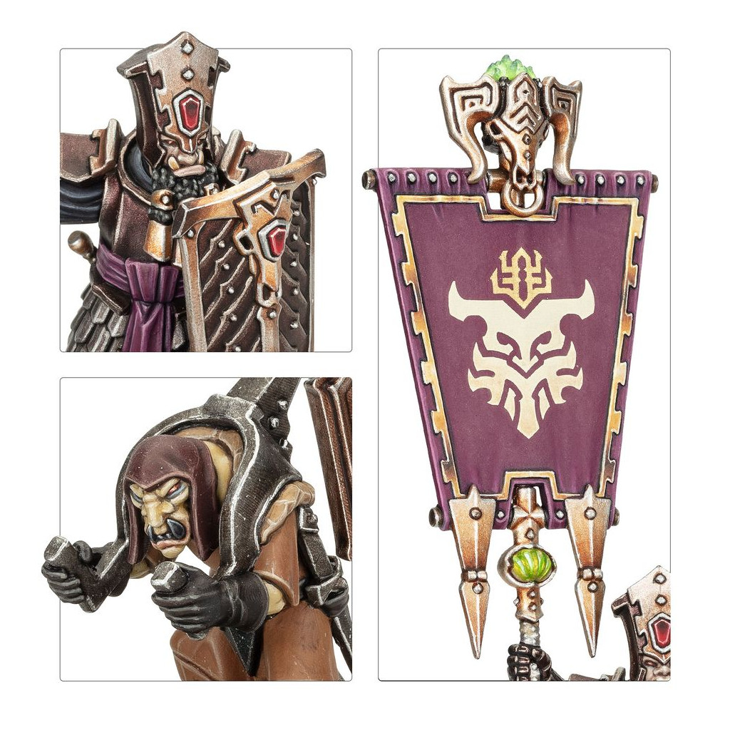 Le kit inclut les éléments pour assembler un champion optionnel avec un choix entre deux têtes, armé d'une hache à deux mains ou d'un marteau et d'un bouclier. Le porte-étendard optionnel dispose de trois options de tête et de trois sommets de bannière. Le musicien optionnel est accompagné d'un Hobgrot offrant un choix entre deux têtes. Les boucliers et les bras gauches sont interchangeables entre toutes les figurines, ce qui rend facile de personnaliser vos guerriers disciplinés et implacables.
