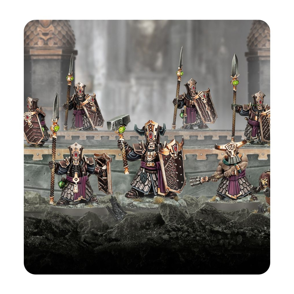 Les Cohortes Infernales forment le cœur noir des osts des Zharrdrons. Recrutés en grande partie au sein des clans royaux, ces duardins revêtent des atours et un faste qui ne les empêchent pas de faire preuve d’un talent impitoyable au combat. Leurs régiments partent en guerre armés de lames ou de lances brûlant d’une énergie démoniaque. Ils forment un mur de mort qui avance au son des gongs ésotériques et massacre l’ennemi sans merci.