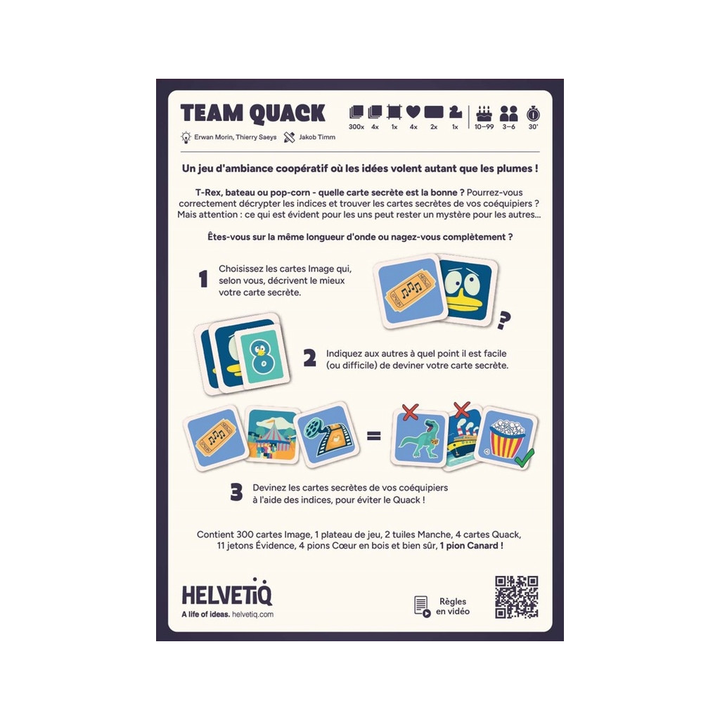 Team Quack est un jeu coopératif dans lequel vous devrez deviner et faire deviner des images secrètes en utilisant des cartes indices. À chaque manche, vous devrez évaluer la clarté de vos indices et la facilité avec laquelle vos coéquipiers devineront votre Carte Secrète. Mais attention, trop d'erreurs vous feront perdre de précieuses vies ! Votre équipe sera t-elle sur la même longueur d'onde.
