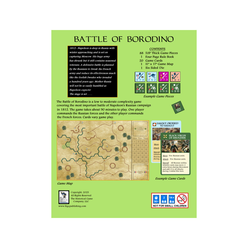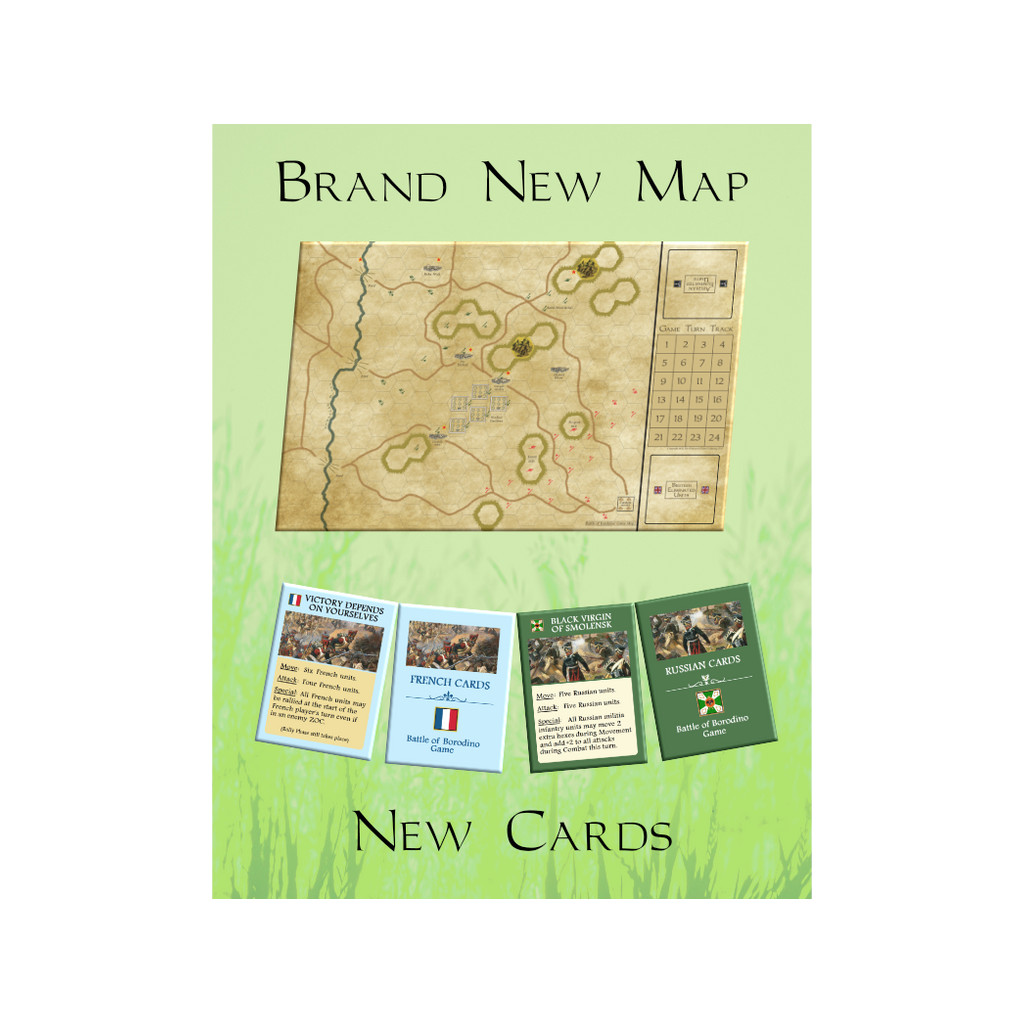 Battle of Borodino est un jeu tactique à complexité faible à modérée se déroulant pendant les Guerres Napoléoniennes. En 1812, Napoléon et son armée française ont Moscou en ligne de mire. Qui l’emportera ?