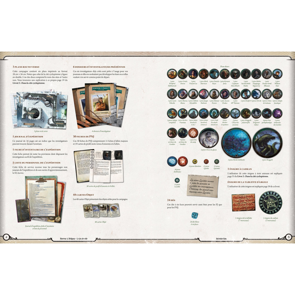 Terra Antarctica, ce sont 50 heures de jeux, durant lesquelles exploration, action et héroïsme seront au rendez-vous ! Cette boîte est un condensé d’aventures épiques et d’épouvante glaciale. Elle contient tout le matériel pour plonger rapidement dans une campagne légendaire. es joueuses et les joueurs peuvent la vivre avec leurs personnages ou préferer choisir parmi les six disponibles.