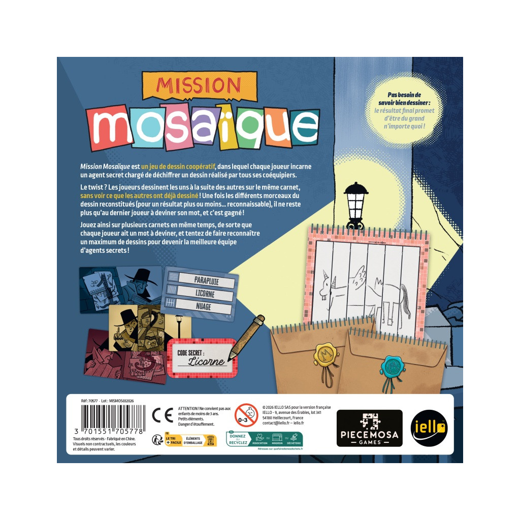 Mission Mosaïque est un jeu de dessin collaboratif dans lequel les joueurs font équipe et transmettent des codes secrets. Les joueurs doivent travailler ensemble pour dessiner des images afin que la personne assise à leur droite puisse deviner les codes secrets.