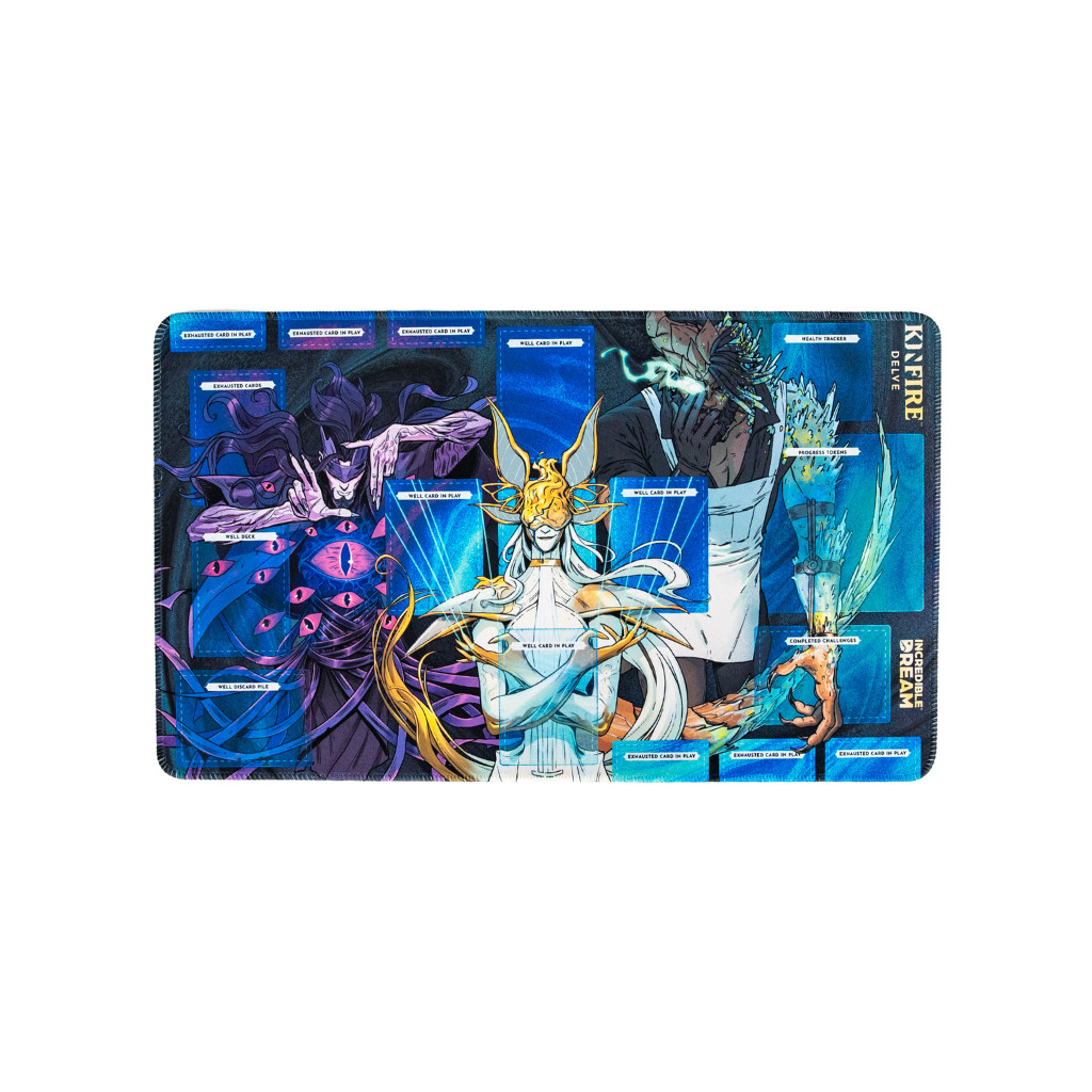 Ce tapis de jeu est spécialement conçu pour le Maître du Puits que vous affronterez. Il comprend des emplacements dédiés pour votre deck du puits, la défausse, les cartes épuisées, les jetons de progression, le compteur de vie, ainsi que le Maître du Puits et ses défis.