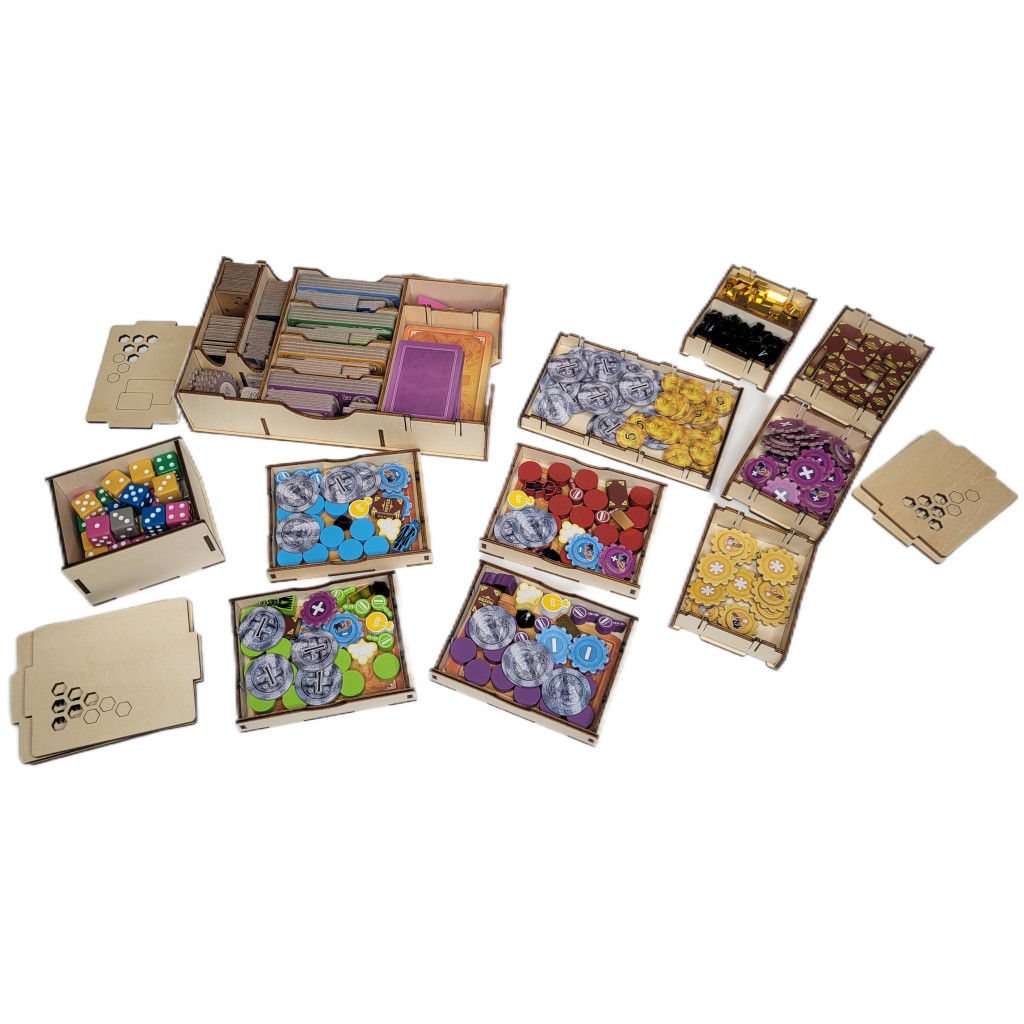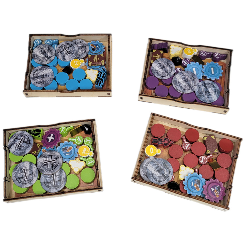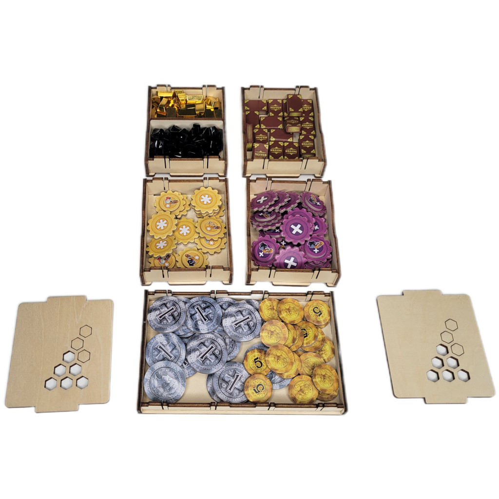 - 5 Boites empilables pour les Ressources (Charbon et Bronze), les Pièces, les Engrenages violets, les Engrenages jaunes et les Livres