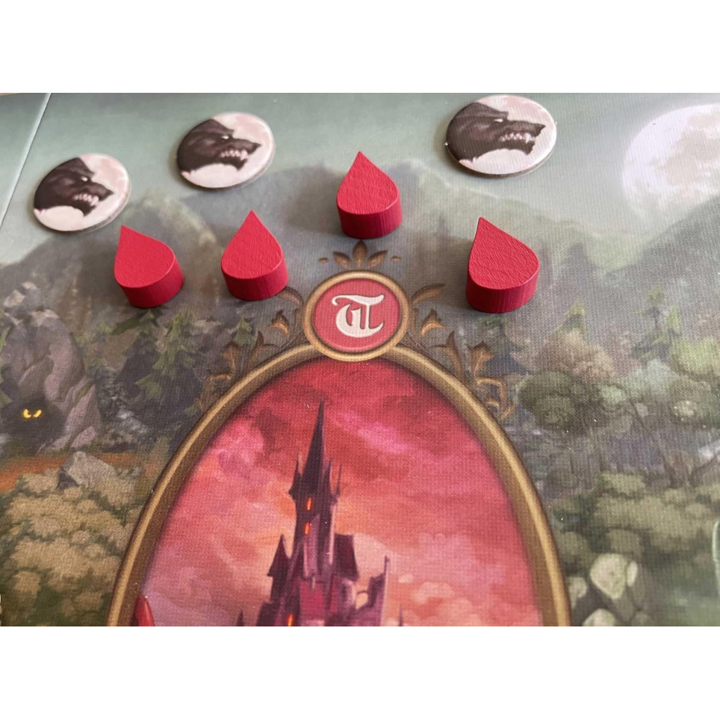 Chaque fois que vous déposerez des invités à la destination de leur choix, ils laisseront des jetons de sang dont se nourriront les vampires (cercueils) du château local... mais aussi les loups-garous de la région.