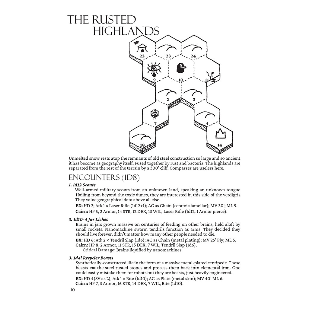 - 36 hexagones détaillés, avec procédures de voyage, tables météo et butin, rencontres aléatoires et événements capables de bouleverser le monde.
