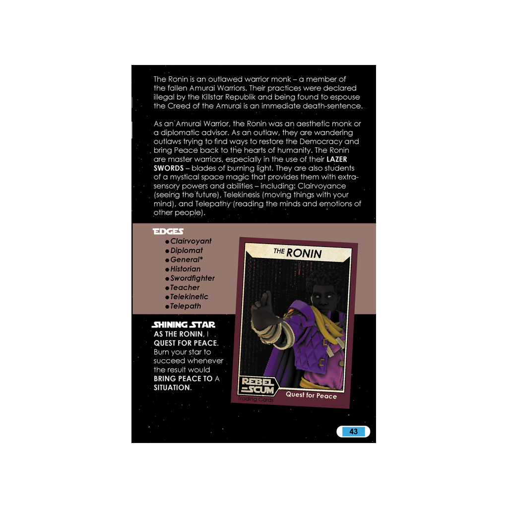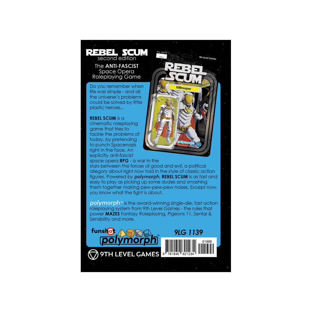 Rebel Scum raconte l’histoire de héros rebelles et antifascistes qui luttent contre un gouvernement doté d’un pouvoir illimité (incluant des lasers géants et de la magie spatiale). Inspiré par l’amour d’une certaine gamme de figurines d’action de 9,5 cm, ce jeu de rôle sur table vous invite à imaginer votre propre drame spatial cinématographique.