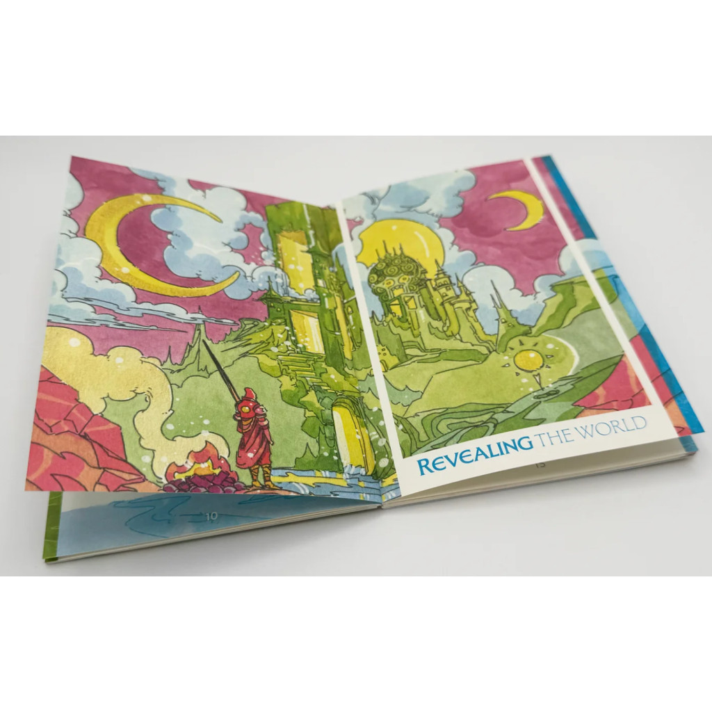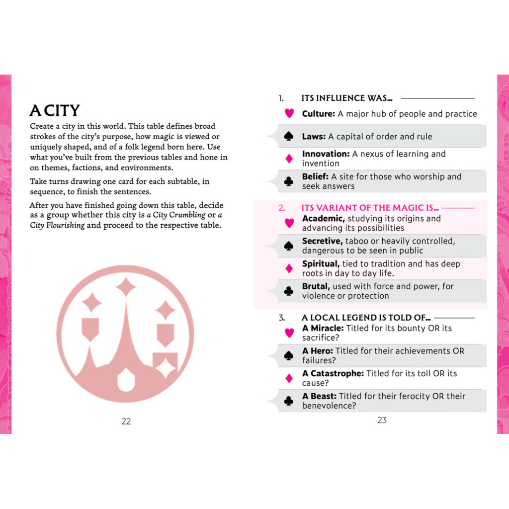 Rejouabilité : Chaque partie est unique. Vous commencez par établir une palette et choisir des références pour définir votre monde. Une variété d’invitations et de tables guident la création de cet univers. Par exemple, que donne un monde “orageux, doré, et dentelé” avec La Revanche d’une blonde et Hellboy comme inspirations ?