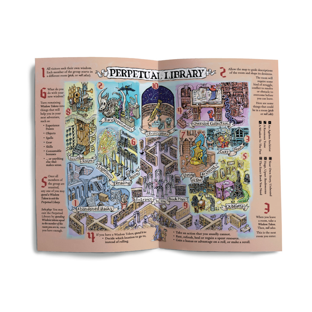- The Perpetual Library : Une mini-aventure autonome basée sur une carte, où vous explorez une bibliothèque multiverselle en quête de sagesse. À jouer en one-shot ou comme supplément pour toute campagne mêlant enquête et aventure. Achat numérique incluant des PDF imprimables pour les formats Letter et A4.