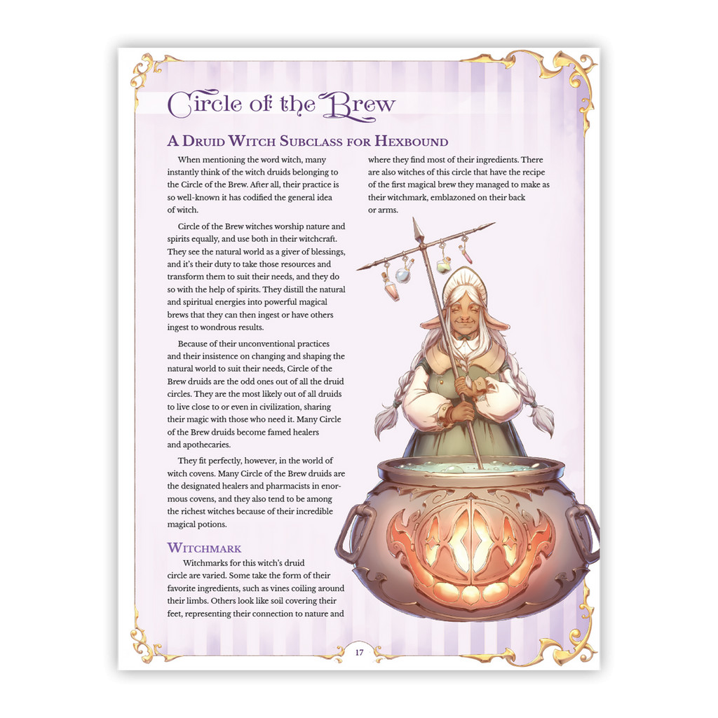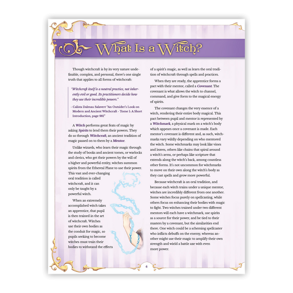 Dans la 5e édition, des termes comme sorcier, magicien ou ensorceleur ont des significations spécifiques, et de la même manière, Hexbound donne au mot « sorcière » une nouvelle signification. Ces éléments de l'histoire vous permettent de créer des histoires de personnages plus profondes et plus complexes donnant à votre MJ toutes sortes d'outils à utiliser pour intégrer l'histoire de votre personnage dans un monde plus vaste.