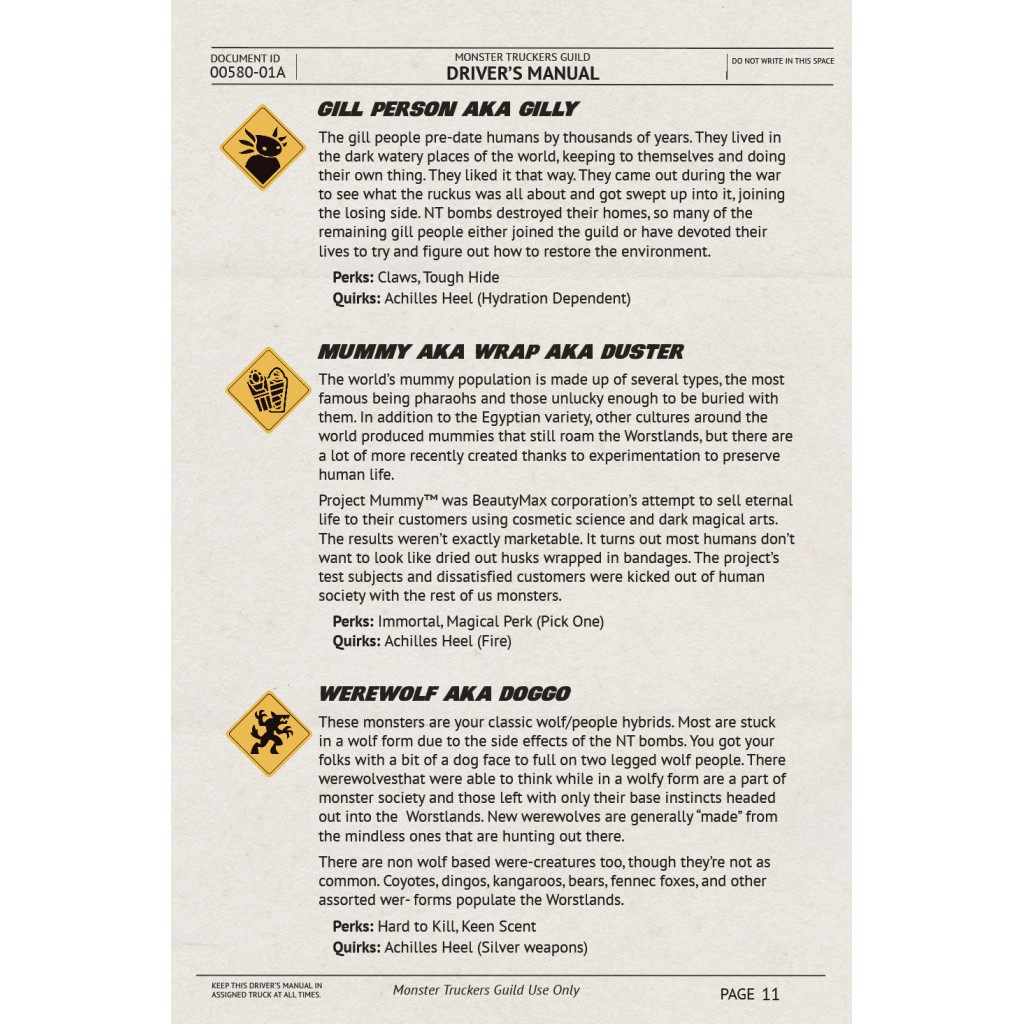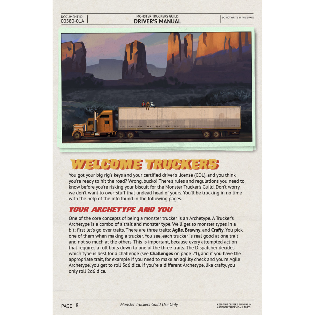 Prenez le volant d’un poids lourd en incarnant un monstre classique : vampire, momie, loup-garou, fantôme et bien d’autres ! Monster Truckers est un jeu de rôle facile à apprendre et nécessitant peu de préparation, mettant en scène des monstres conducteurs de semi-remorques dans un monde post-apocalyptique. Entre deux livraisons, ils découvrent des phénomènes étranges, s’attirent des ennuis et aident parfois leur prochain tout en goûtant aux joies de la (non)vie sur la route.