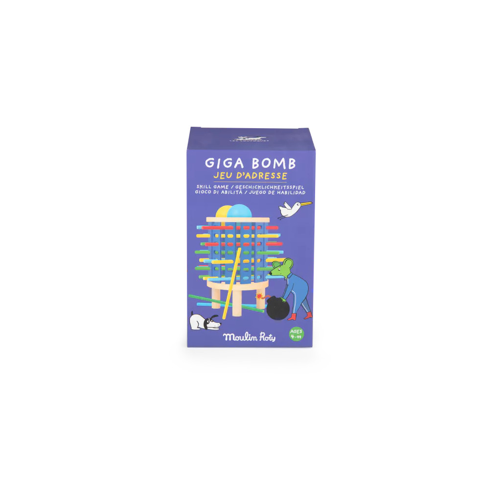 Boum ! En compétition ou en coopération, tous ensemble contre la Giga Bombe ! Le but du jeu est de conserver sa boule dans la tour le plus longtemps possible sans faire tomber la Giga Bombe en bois. Se joue entre 2 et 3 joueurs, à partir de 4 ans.