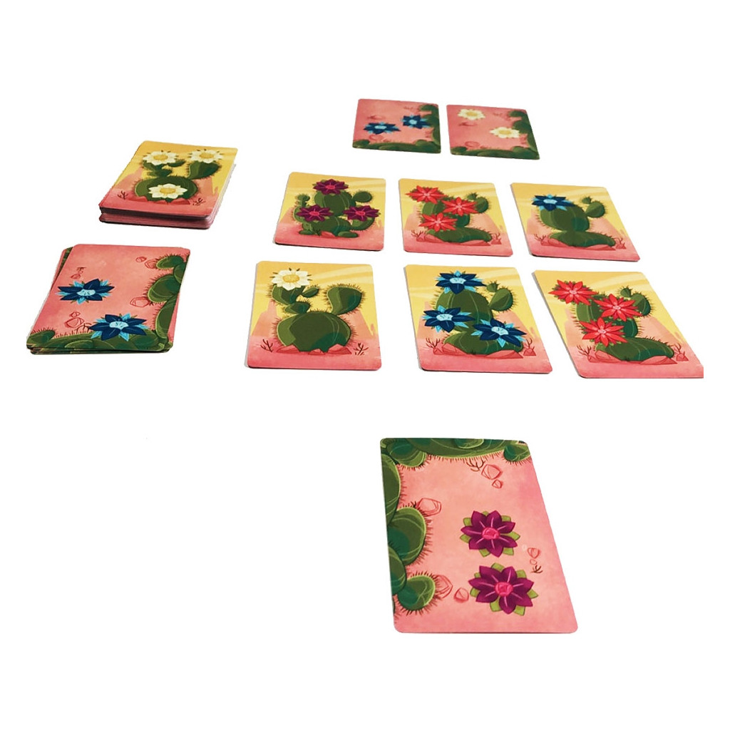 Vous vous trouvez au cœur du désert à la recherche de magnifiques fleurs de cactus. À votre tour, vous choisirez l'une des 4 faces d'une carte Cactus et la retournerez. Si des épines de cactus apparaissent sur la face choisie : mauvaise nouvelle ! Vous êtes piqué et ne pouvez pas cueillir les fleurs. Plus une carte contient de fleurs, plus elle est dangereuse, alors soyez prudent !