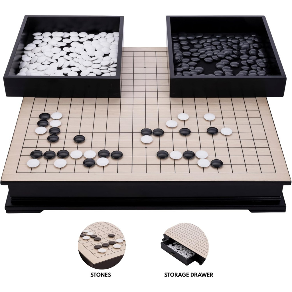 Jeu de Go comprenant 361 pierres de Go en plastique (21 mm). Dimensions : 50 × 44 × 8 cm.