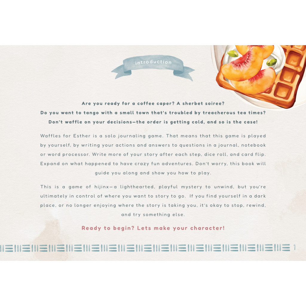 Waffles for Esther est une expérience solo : prenez un carnet, des dés, un jeu de cartes, et préparez-vous à écrire votre propre enquête autour d’une gaufre.
