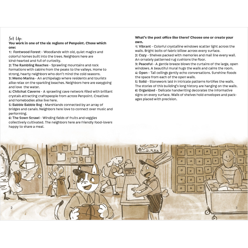 Out for Delivery est un jeu mêlant devoir et émerveillement. Vous y incarnez un Messager parcourant les Îles Penpoint. Depuis votre bureau de poste, vous générerez le courrier à livrer à l’aide d’un jeu de cartes, tout en tenant le journal de vos expériences. Faites la connaissance de vos voisins, explorez la région et découvrez les histoires qui s’y cachent.