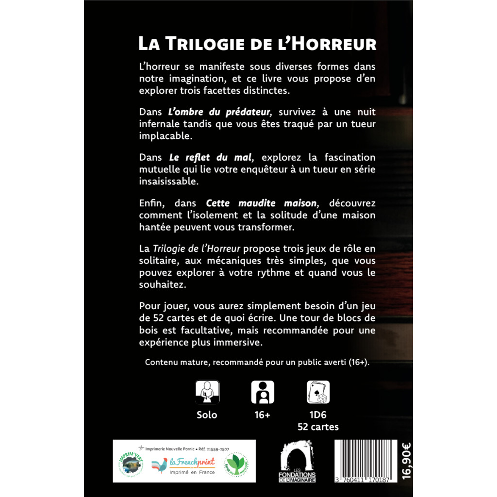 La Trilogie de l’Horreur propose trois jeux de rôle en solitaire, aux mécaniques très simples, que vous pouvez explorer à votre rythme et quand vous le souhaitez.