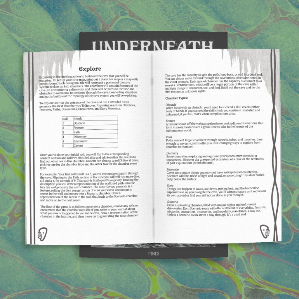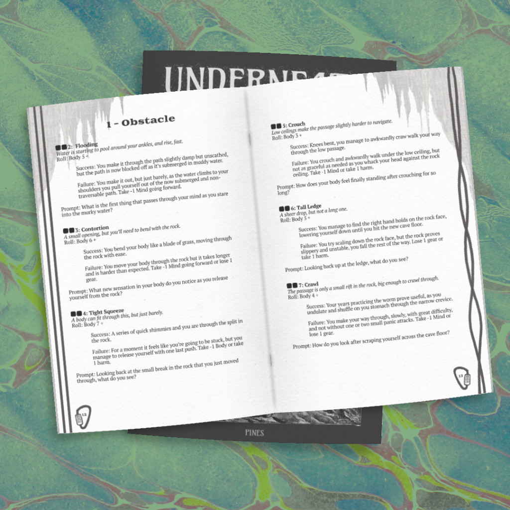 Underneath est un jeu en solo de création de carte et de journaling que vous jouerez entre le livret de jeu, votre journal d’expédition, une carte et une paire de dés à six faces propulsant votre personnage à travers ce système de grottes.