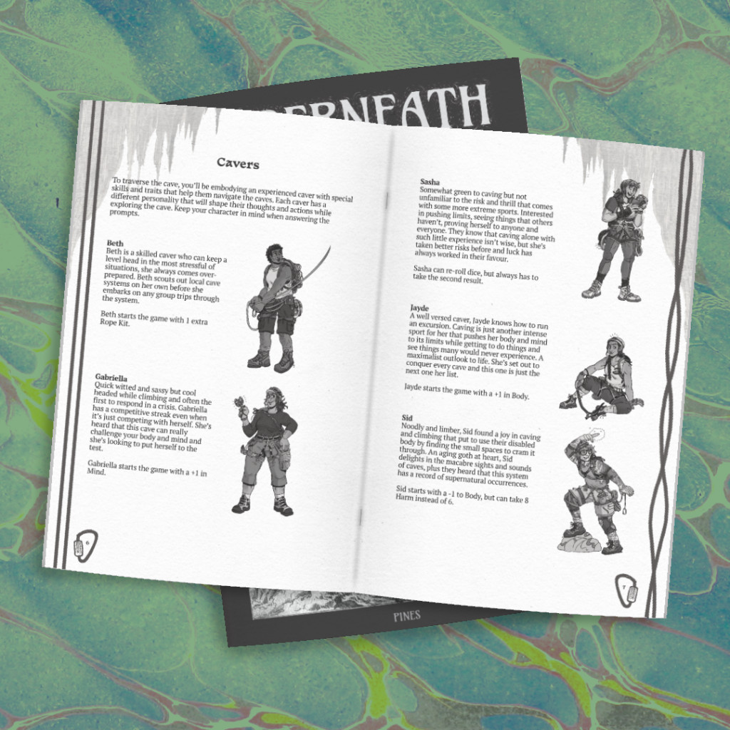 Underneath est un jeu en solo d'exploration de grottes et de cartographie des choses inattendues que vous rencontrez sous terre. Cartographiez, tenez un journal et lancez les dés pour construire un réseau de grottes sinueuses tout en affrontant les dangers et périls que les cavernes souterraines ont à offrir. Construisez un réseau de grottes, découvrez ses poches inconnues et cartographiez vos trouvailles.