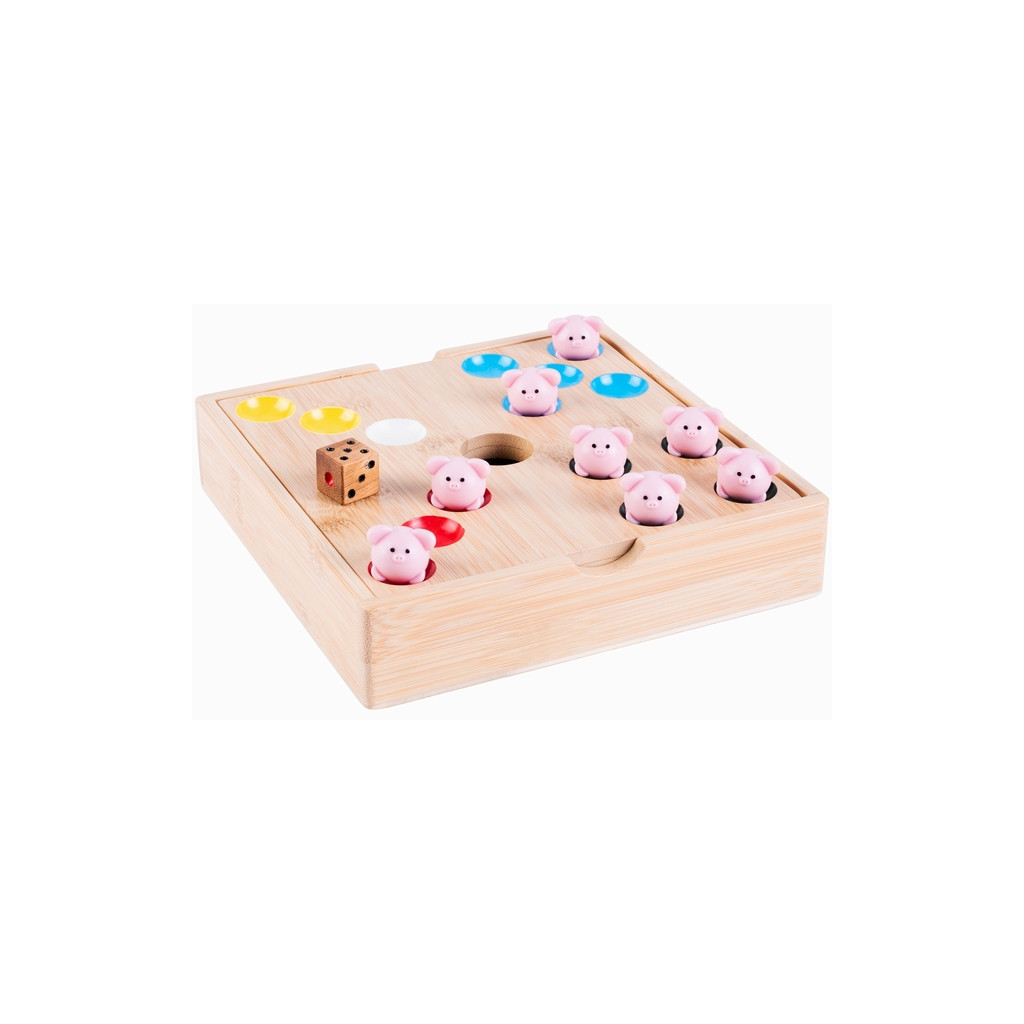 Débarrasse-toi de tous tes cochons en les plaçant sur les espaces correspondants à tes lancers de dés... Mais attention à ne pas être trop gourmand, car si tous les espaces du chiffre sont occupés, tu récupères les cochons au lieu de t'en débarrasser ! Si tu fais un 6, ton cochon disparait dans le trou.