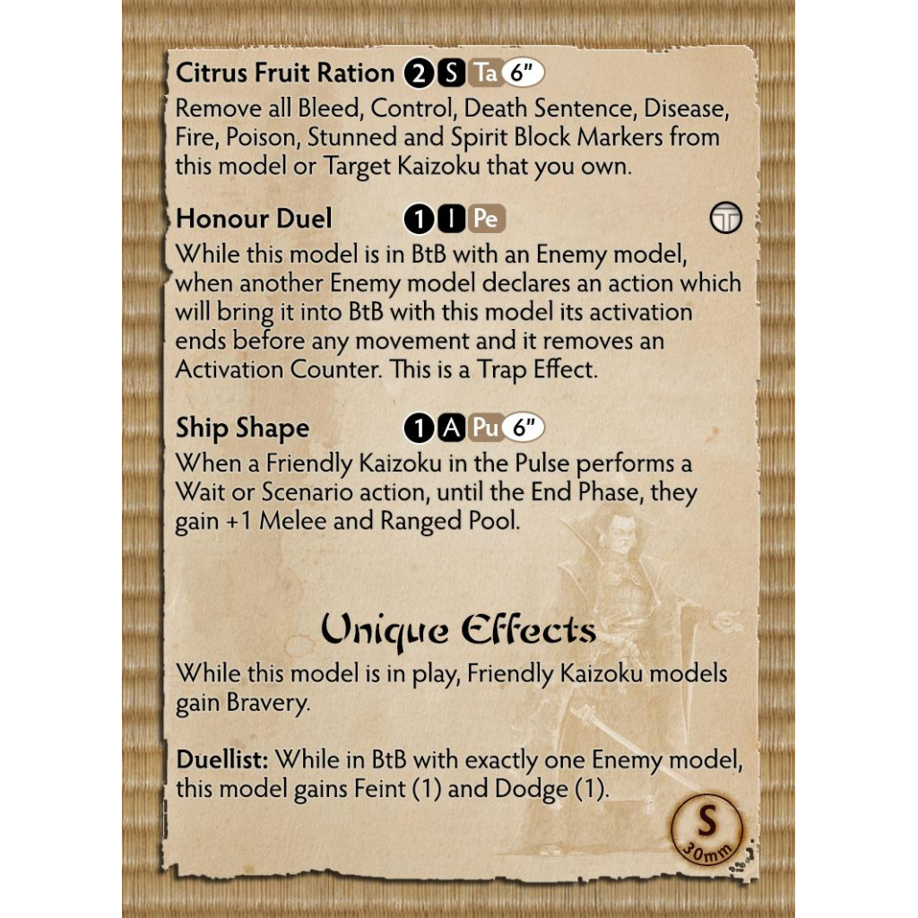 Un nouveau capitaine signifie un nouvel équipage à explorer. Dans Bushido, différents équipages sont représentés en accordant aux Kaizoku un bonus provenant du Modèle du Capitaine et du Thème du Capitaine. Dans ce cas, Courage et Armure font que les humbles marins deviennent un groupe beaucoup plus fiable. Les attaques coordonnées et les bonus de combat lorsqu’ils sont Commandés les rendent encore plus puissants.