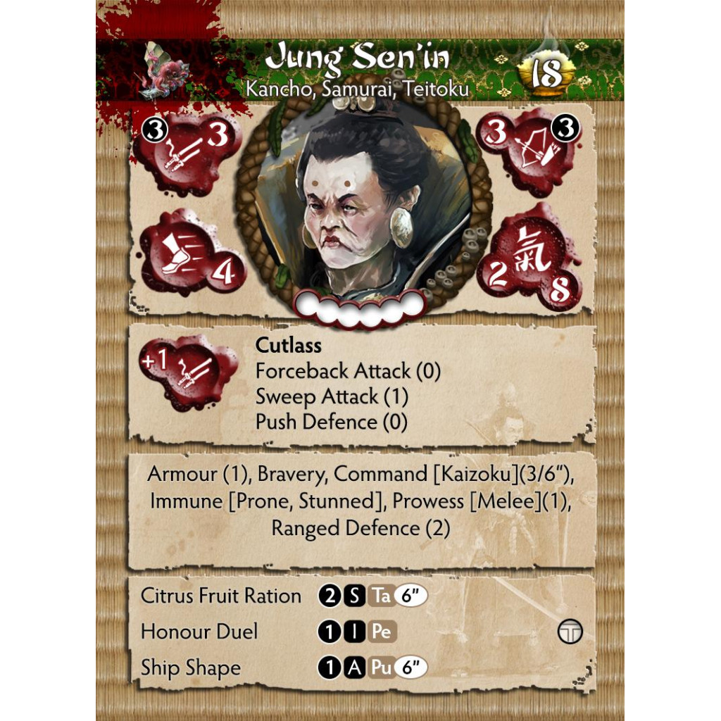 Sen’in existait à l’époque où les Jung étaient encore un clan samouraï loyal et la marine officielle des îles Jwar. Grâce à ses nombreuses années de service fidèle auprès des Jung, elle a obtenu le prestigieux grade de Commodore. Sen’in dirige son navire avec rigueur, ne tolérant pas le chaos habituel des pirates que l’on trouve sur d’autres bateaux. Elle navigue avec un détachement de marines hautement entraînés et disciplinés, qui n’interviennent que lorsque la violence est imminente. Autrement, ils dorment, mangent et s’entraînent dans des quartiers séparés du reste de l’équipage.
