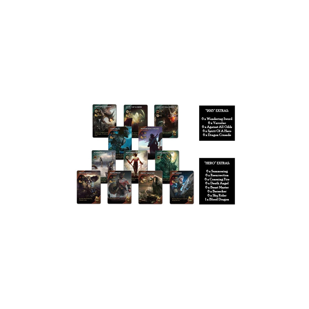 Les extensions « Héros » et « 2015 » de Draconis Invasion sont les cartes exclusives rééditées pour l'édition Héros et les extensions Kickstarter de 2015.