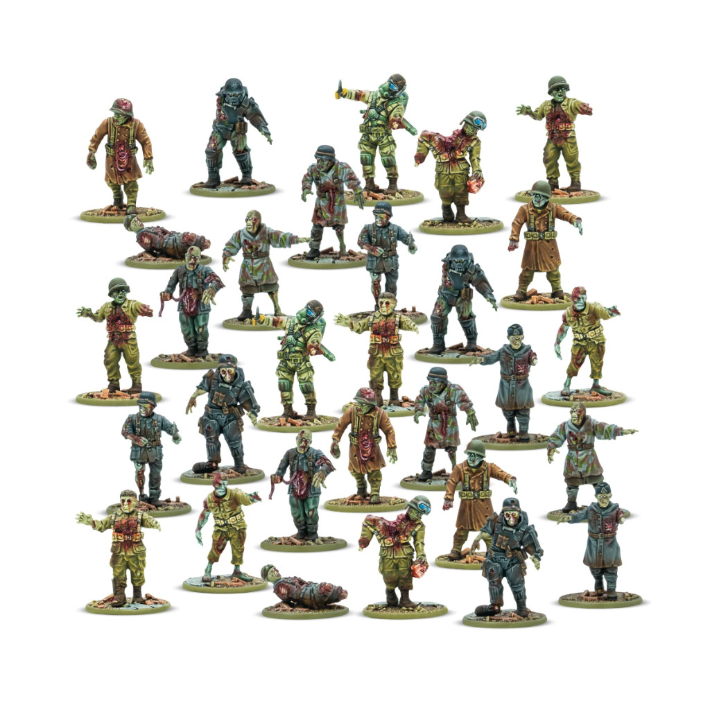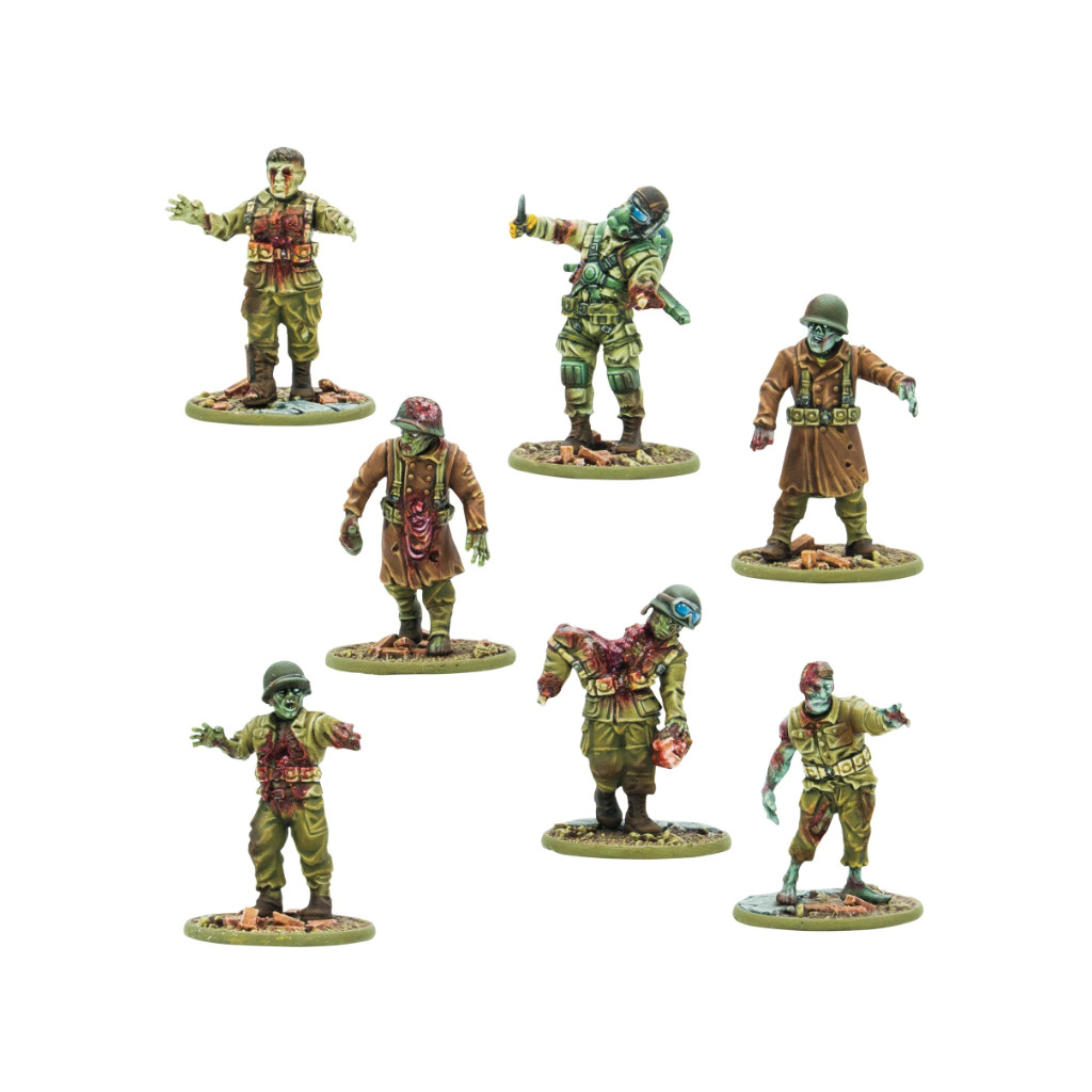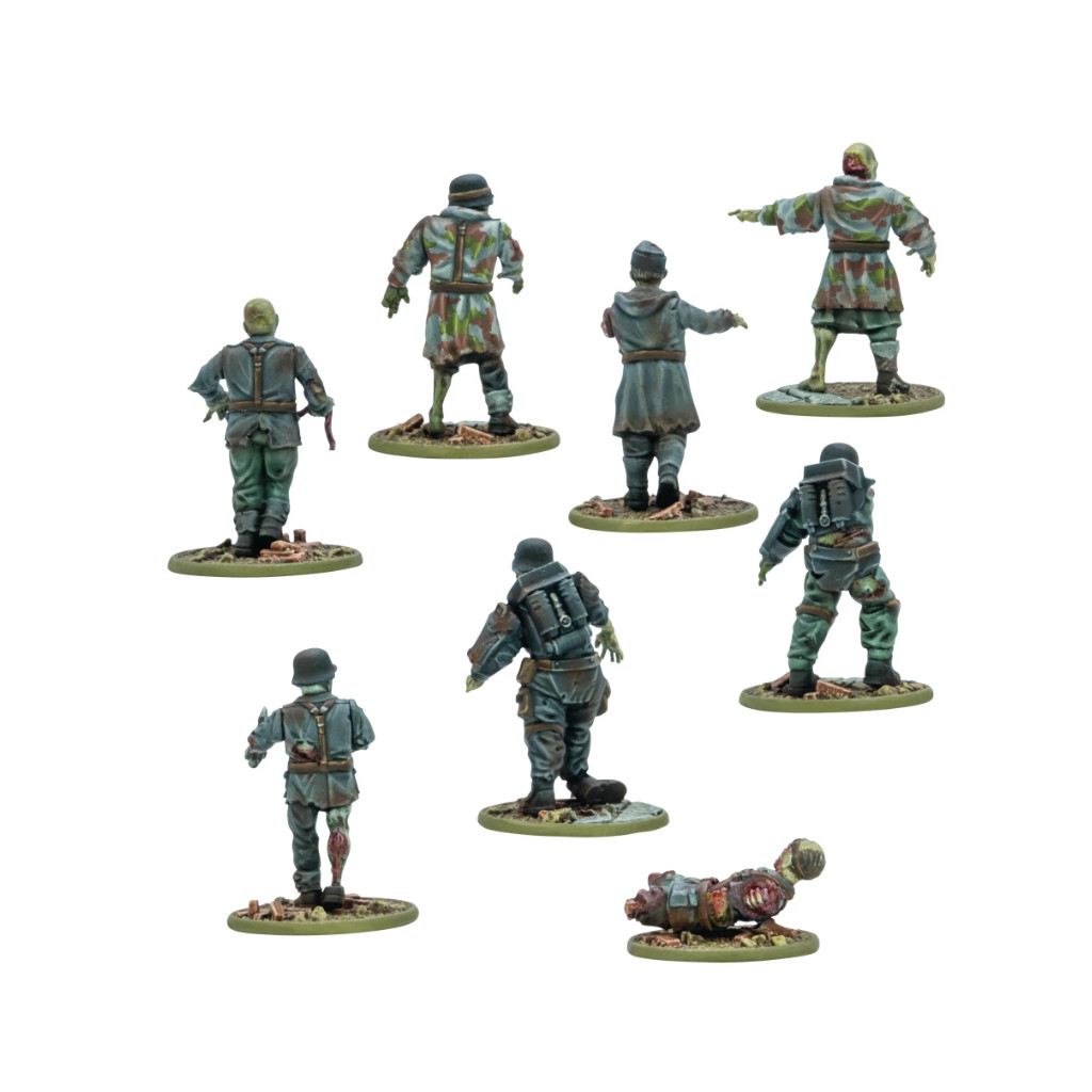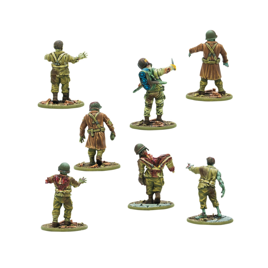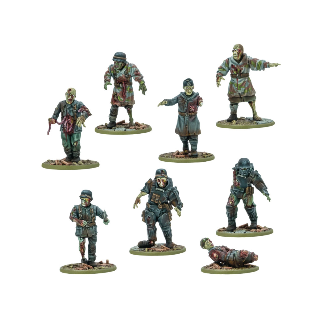 La grappe en plastique Totenkorps comprend des soldats réanimés portant différents types d'uniformes provenant des morts de l'Axe et des États-Unis, y compris un Firefly américain et un Schwertruppen de l'Axe !